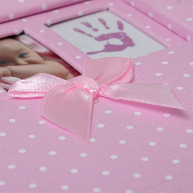 Materiał ma różowy kolor i białe, małe kropeczki. Na środku albumu znajdują się trzy małe kwadratowe okienka - ramki na wybrane zdjęcia.