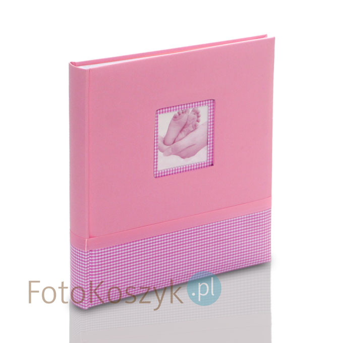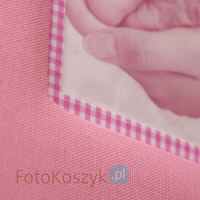 Okładka albumu wykonana jest z grubego, różowego płótna. Górna część pozostaje jednolicie różowa, dolna pokryta jest subtelną biało‑różową kratką. Obie części łączy elegancka, różowa satynowa wstążka, która nadaje całości delikatności i stylu. To idealna oprawa na wspomnienia z pierwszych miesięcy życia dziecka.