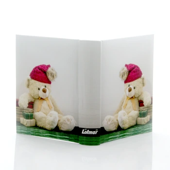 Okładka wykonana jest z laminowanego kartonu i ozdobiona wesołym misiem w czerwonej, zimowej czapce z pomponem. Miś siedzi na zielonej podłodze, opierając się o stos kolorowych prezentów – całość tworzy radosny, dziecięcy klimat.