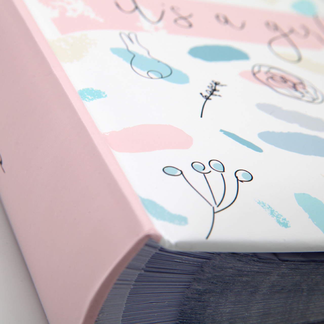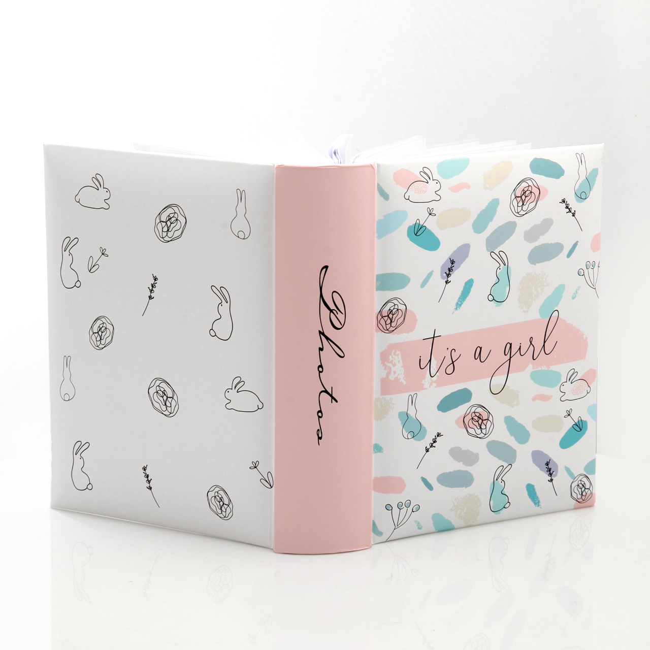 💎 Okładka albumu wykonana została z laminowanego kartonu i utrzymana w jasnej kolorystyce z pastelowymi motywami: króliczkami, kwiatkami, gałązkami i kolorowymi plamkami. Na środku znajduje się różowe pole z eleganckim napisem "it's a girl", a różowy grzbiet albumu nadaje całości subtelnego, dziewczęcego charakteru.