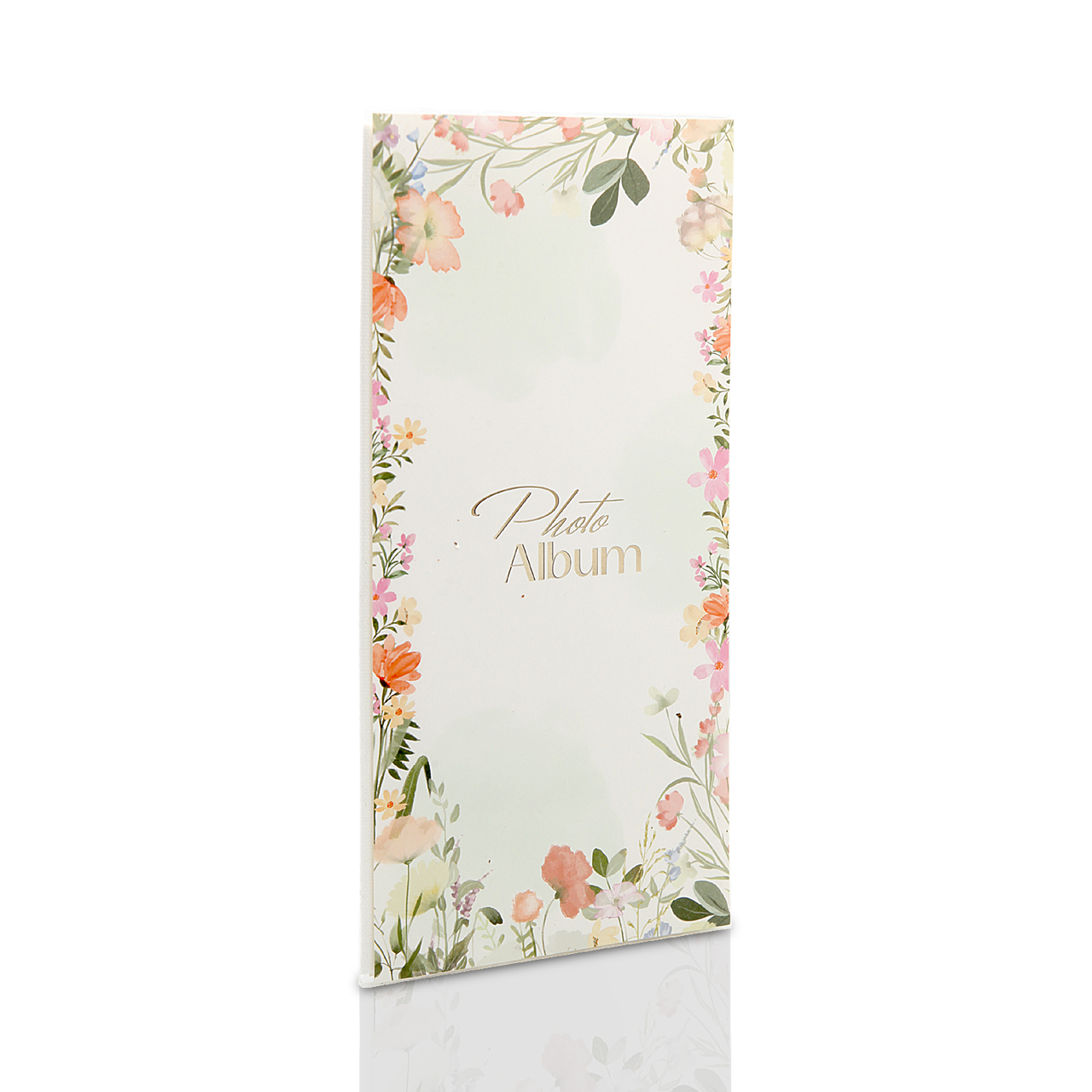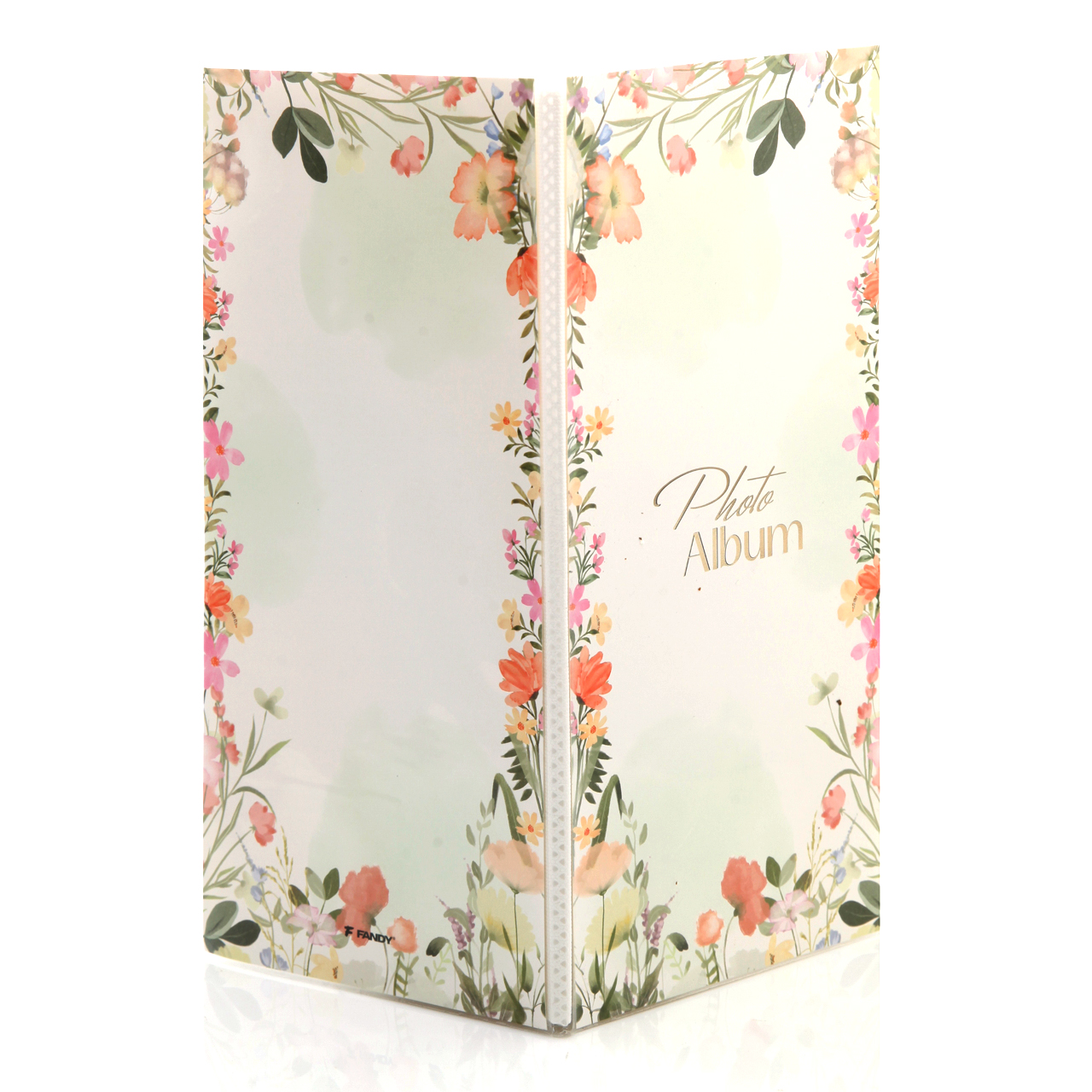 Okładka została wykonana z przezroczystego tworzywa i ozdobiona grafiką kolorowych kwiatuszków. Centralnym punktem jest napis Photo Album w złotym kolorze. Tył zdobi dokładnie taka sama grafika jak z przodu, jedynie bez napisu w środku. Co ważne – okładkę można wymienić, wkładając w jej miejsce własną fotografię, dzięki czemu album zyskuje indywidualny styl.