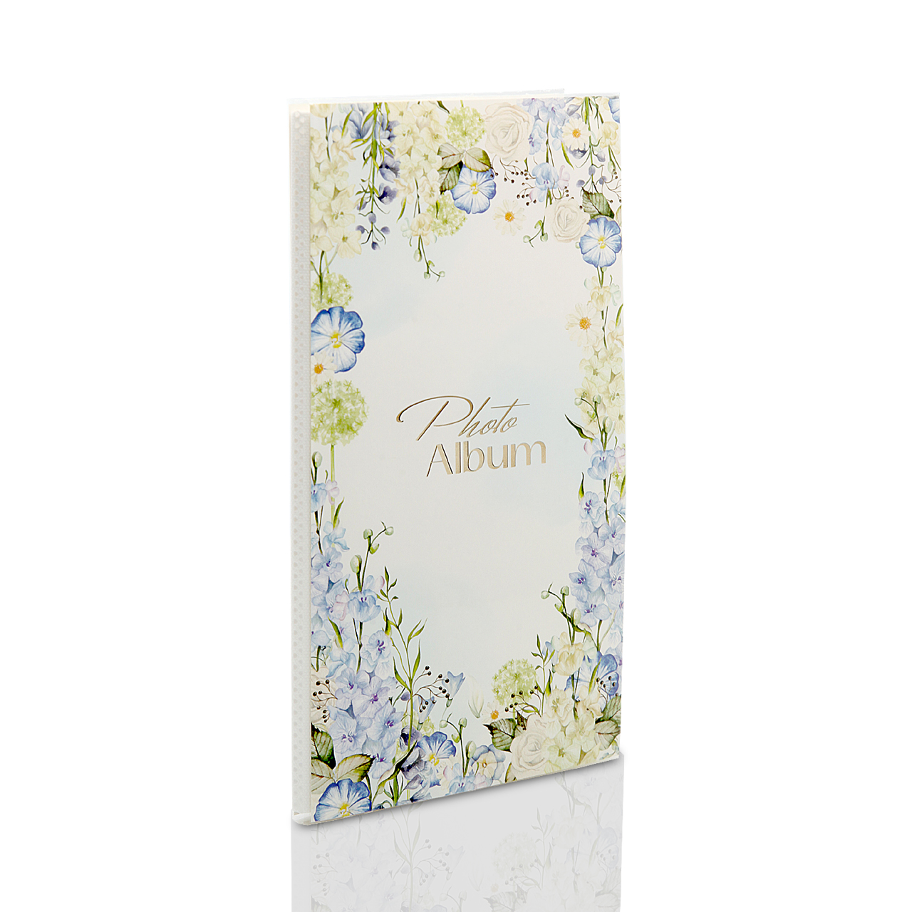 Okładka została wykonana z przezroczystego tworzywa i ozdobiona grafiką biało-niebieskich kwiatuszków. Centralnym punktem jest napis Photo Album w złotym kolorze. Tył zdobi dokładnie taka sama grafika jak z przodu, jedynie bez napisu w środku. Co ważne – okładkę można wymienić, wkładając w jej miejsce własną fotografię, dzięki czemu album zyskuje indywidualny styl.