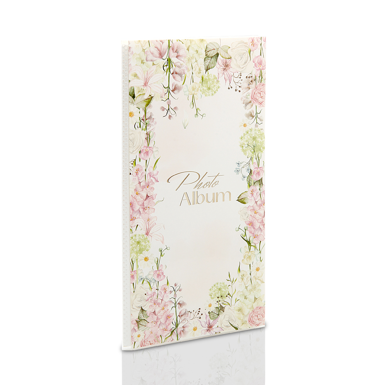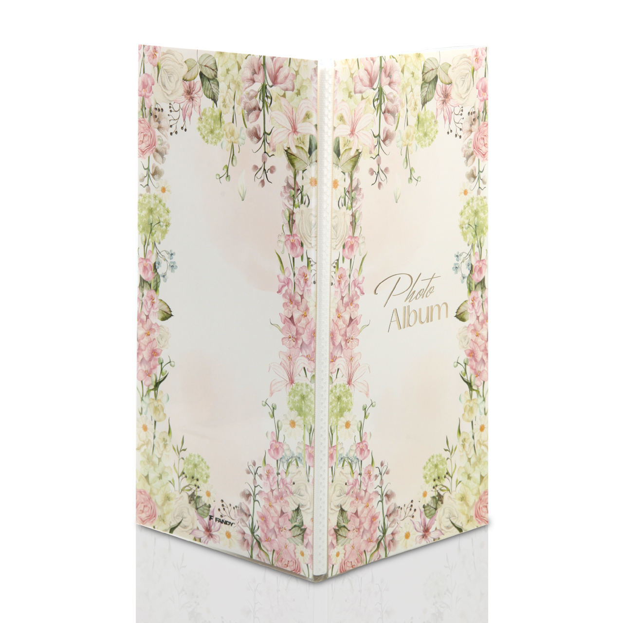Okładka została wykonana z przezroczystego tworzywa i ozdobiona grafiką biało-różowych kwiatuszków. Centralnym punktem jest napis Photo Album w złotym kolorze. Tył zdobi dokładnie taka sama grafika jak z przodu, jedynie bez napisu w środku. Co ważne – okładkę można wymienić, wkładając w jej miejsce własną fotografię, dzięki czemu album zyskuje indywidualny styl.