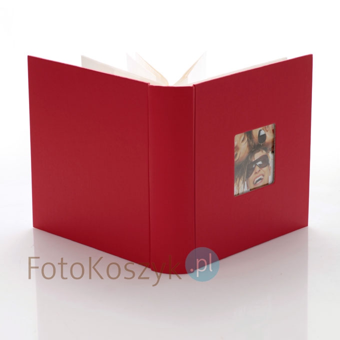 Okładka albumu wykonana jest z wysokiej jakości papieru ozdobnego o wyraźnej strukturze płótna. Nasycony, głęboki odcień czerwieni przyciąga uwagę i symbolizuje uczucia, które towarzyszą najważniejszym momentom w życiu. Na środku znajduje się eleganckie okienko (6x6 cm), w którym możesz umieścić ulubione zdjęcie, nadając albumowi osobisty charakter.