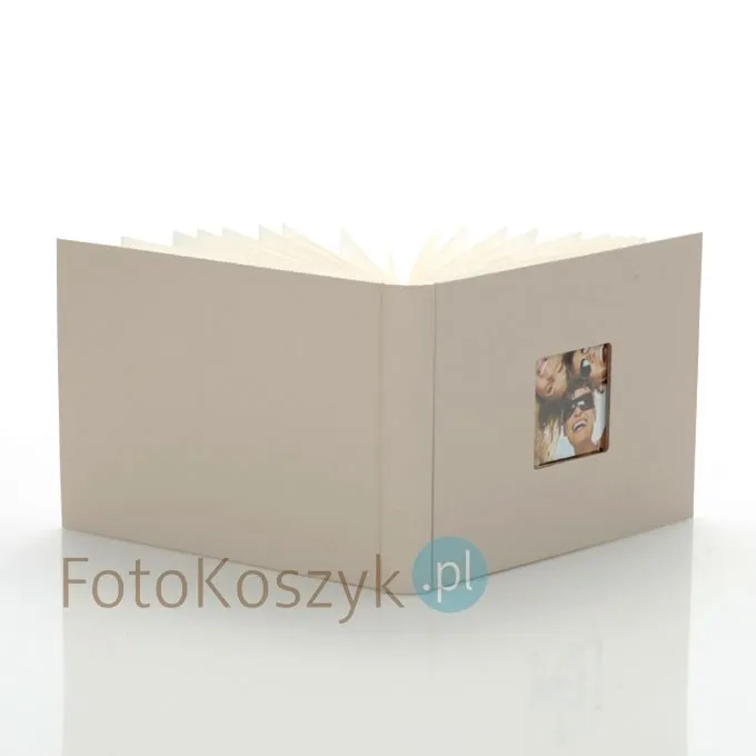 Okładka została pokryta materiałem o strukturze płótna w odcieniu jasnego beżu przypominającego piasek. Ten naturalny, ciepły kolor doskonale wpisuje się w estetykę ślubną, rodzinną i minimalistyczną. Centralne okienko (6x6 cm) pozwala wyeksponować jedno wybrane zdjęcie, zapowiadające zawartość albumu.