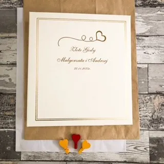 W środku znajdują się grube, kremowe karty umieszczone na metalowym segregatorze.