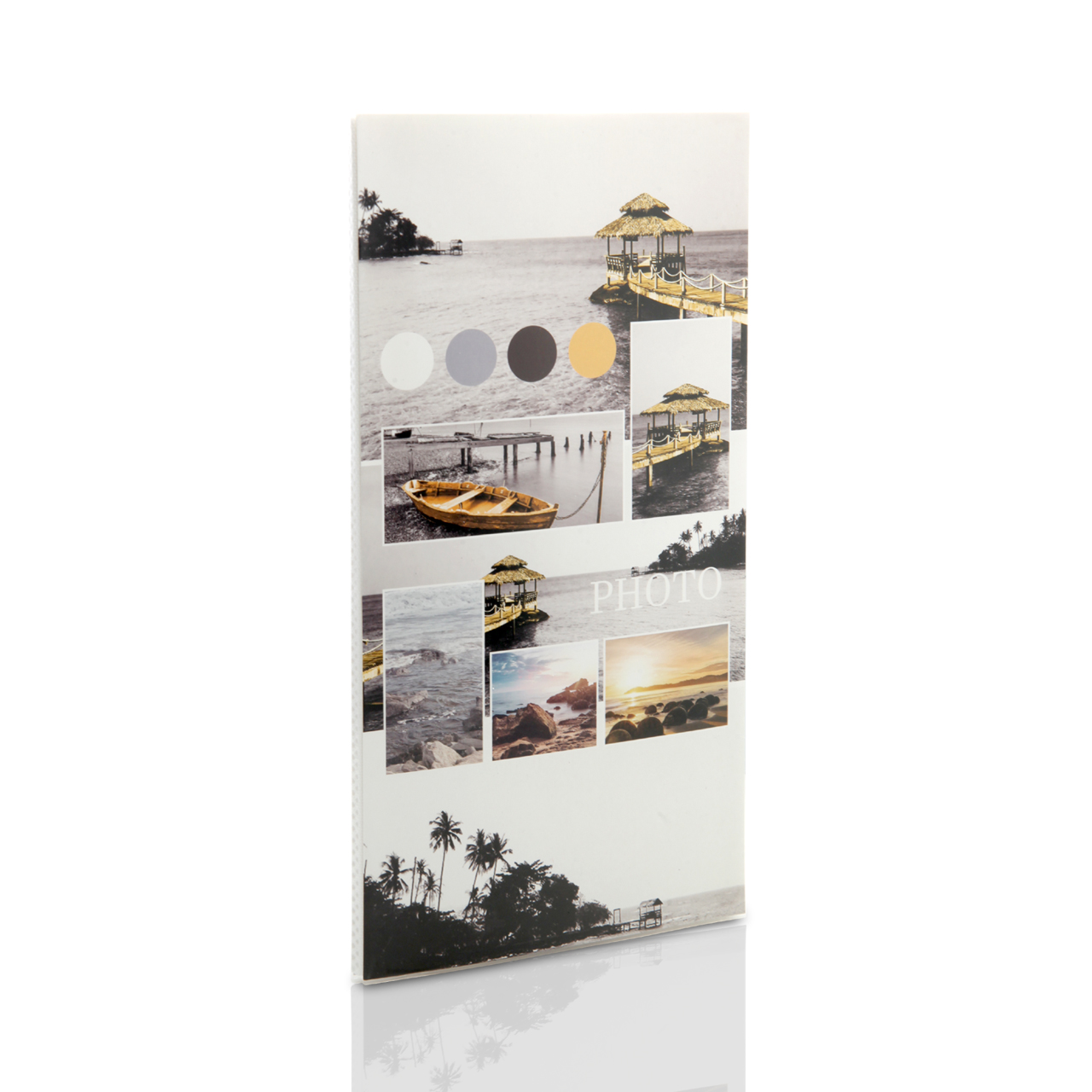 Okładka została wykonana z przezroczystego tworzywa i ozdobiona kolażem zdjęć przedstawiających molo i morze 🌊. Całość nadrukowana jest na szarym tle, które nadaje albumowi energii i wakacyjnego charakteru. Co ważne – okładkę można wymienić, wkładając w jej miejsce własną fotografię, dzięki czemu album zyskuje indywidualny styl. Tył albumu jest również z możliwością wymiany.