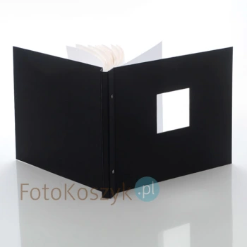 Okładka albumu została wykonana z wysokiej jakości czarnego płótna o nasyconym kolorze i delikatnej fakturze wyczuwalnej pod palcami. Na środku znajduje się duże, kwadratowe okienko, w którym można umieścić zdjęcie z pierwszej strony, nadając albumowi osobisty charakter i wyjątkowy wygląd. Grzbiet oraz tył albumu również pokryte są tym samym materiałem – wszystko tworzy elegancką, spójną całość.