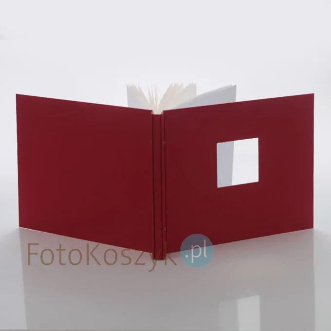 Okładka albumu została pokryta wysokiej jakości materiałem – płótnem w intensywnym czerwonym kolorze. Tkanina ma subtelną, wyczuwalną pod palcami fakturę, która nadaje całości elegancki, naturalny charakter. Na środku znajduje się duże, kwadratowe okienko, które pozwala umieścić wybrane zdjęcie z pierwszej strony, nadając albumowi indywidualny i osobisty wymiar. Grzbiet i tył albumu pokryto tym samym materiałem – całość tworzy jednolitą, estetyczną formę.