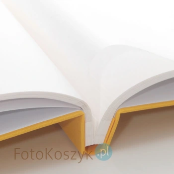 Okładka albumu została pokryta intensywnie żółtym płótnem o delikatnej fakturze, wyczuwalnej pod palcami. W centralnym miejscu umieszczono duże, kwadratowe okienko, w którym możesz umieścić zdjęcie z pierwszej strony – tworząc osobisty akcent i sprawiając, że album od razu zyskuje indywidualny charakter. Grzbiet i tył albumu zostały wykonane z tego samego materiału, co tworzy spójną, elegancką całość.