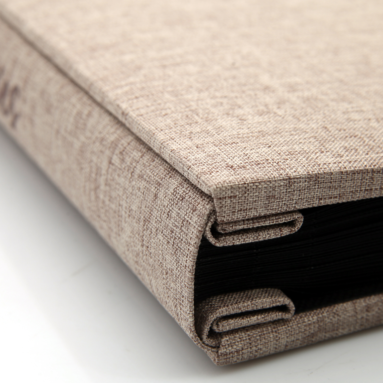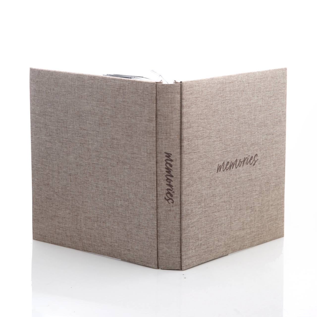 Okładka wykonana jest z matowego materiału o fakturze płótna w odcieniach beżu i brązu. Na środku znajduje się wytłoczony napis „memories”, który subtelnie podkreśla elegancję albumu. Grzbiet i tył zostały pokryte tym samym materiałem, dzięki czemu album prezentuje się spójnie i klasycznie.