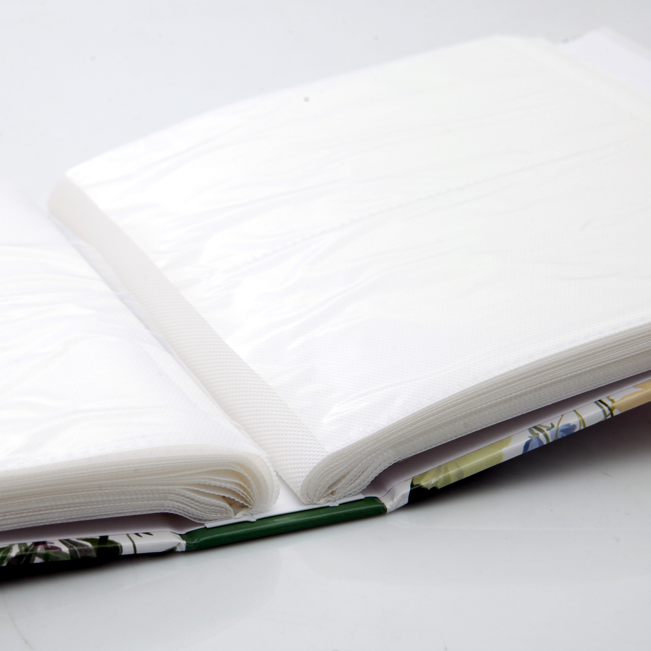W środku umieszczono kieszonki z PVC, które chronią fotografie i ułatwiają ich przeglądanie. Na jednej stronie mieszczą się dwa zdjęcia w formacie 10x15 cm, co łącznie daje miejsce na 200 fotografii. Karty zgrzewane na gorąco zapewniają trwałość i solidność albumu.