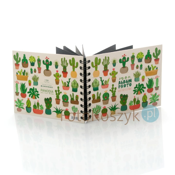 Okładka wykonana została z kremowego, matowego papieru, który pochłania światło i podkreśla rysunkowe detale. Całość zdobi kolekcja kaktusów – każdy inny, każdy z charakterem. Doniczki oraz inne drobne elementy pokryte są lakierem, który delikatnie odbija światło i nadaje całości głębi. Centralne miejsce zajmuje zabawny napis: mon ALBUM PHOTO. Qui s’y frotte s’y pique – czyli „kto się napatoczy, ten się ukłuje”.