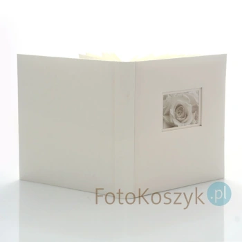 Okładka wykonana jest z grubego, tłoczonego materiału sztucznego, w jasnym, kremowo-białym kolorze ????. Delikatna faktura dodaje subtelnego uroku, a centralnie umieszczone prostokątne okienko (11,5 × 8,5 cm) pozwala na włożenie wybranego zdjęcia – dzięki temu album zyskuje indywidualny charakter i staje się jeszcze bardziej osobistą pamiątką. Grzbiet oraz tył albumu pozostają gładkie, bez dodatkowych zdobień, co nadaje całości prostoty i klasycznej elegancji.