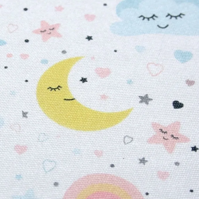 Zadrukowany jest małymi, uśmiechniętymi chmurkami i księżycami.