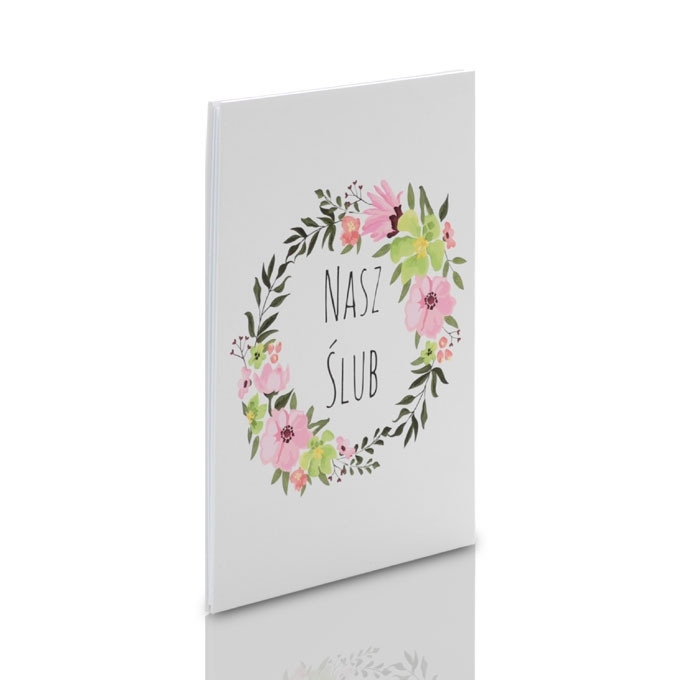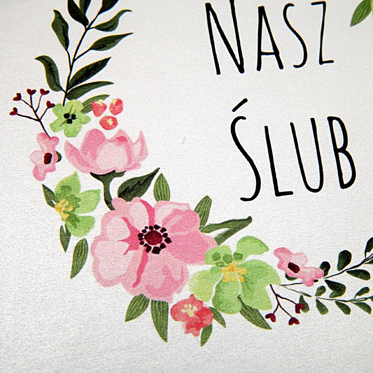 Nadrukowano na nim kolorowe, pastelowe kwiaty oraz napis: Nasz Ślub.