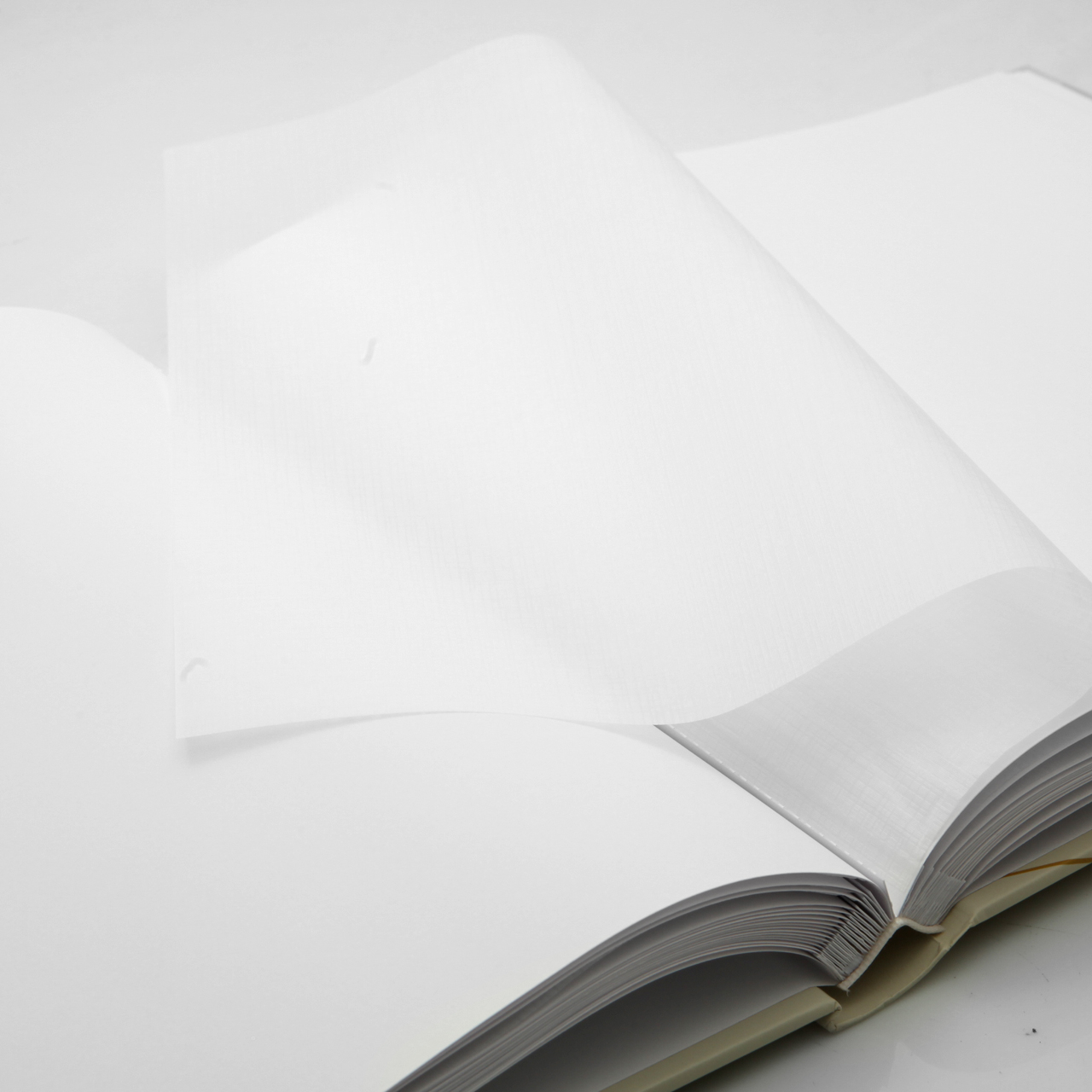 Wewnątrz znajduje się aż 30 dużych, grubych kart (60 stron) wykonanych z białego, bezkwasowego papieru. Każda karta oddzielona jest delikatnym, białym pergaminem, który zabezpiecza zdjęcia przed przetarciami. Album pozwala na dowolne rozmieszczenie fotografii oraz dodanie podpisów, dat i wspomnień.