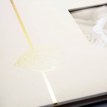 Motyw ozdobny tworzy cienki pasek przypominający wstążkę oraz ażurowe serce z kokardką, które wygląda jak prezent – symbolizując miłość i wyjątkowe chwile. Grzbiet oraz tył albumu są całkowicie gładkie, bez dodatkowych tłoczeń.