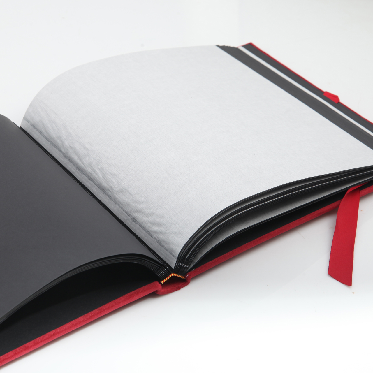 Wewnątrz znajdują się czarne, bezkwasowe karty, przekładane białym pergaminem, chroniącym fotografie przed sklejaniem i zniszczeniem. Strony są starannie wszywane w grzbiet, co zapewnia trwałość i komfort użytkowania.