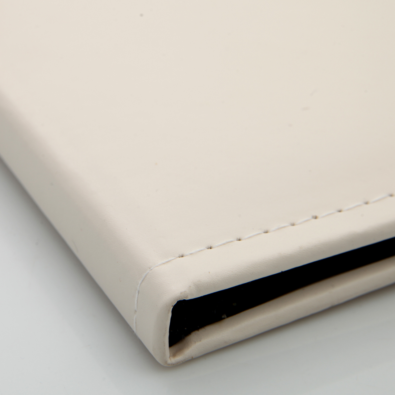 Okładka: biała ekoskóra, przeszywana, z okienkiem 10 × 8 cm