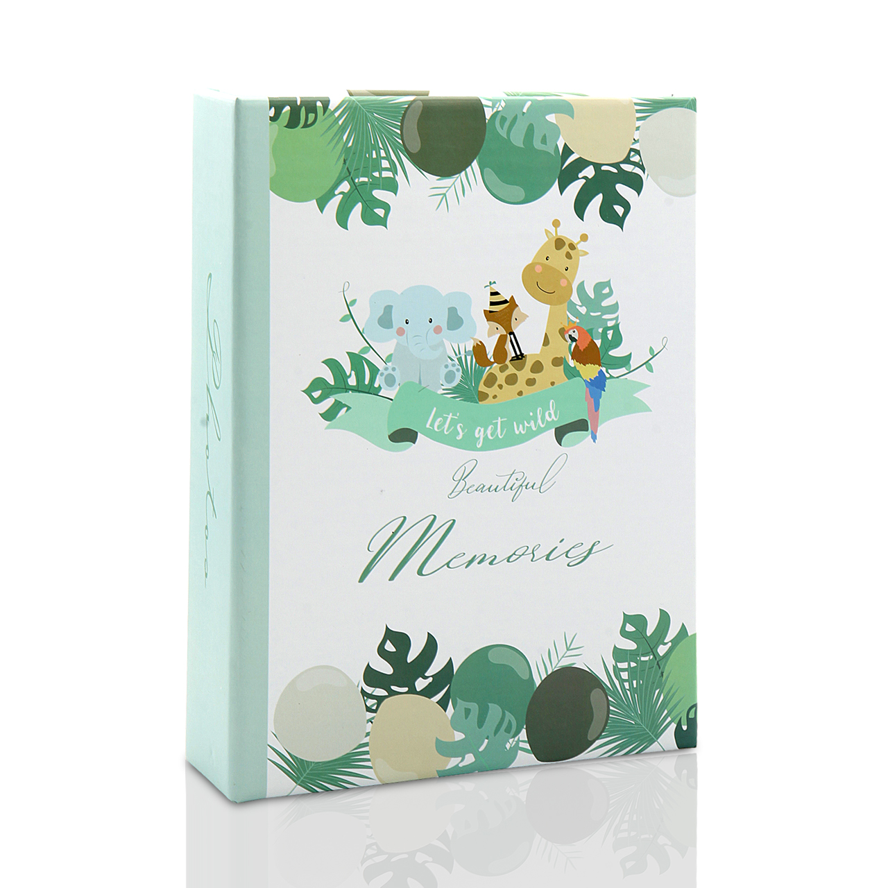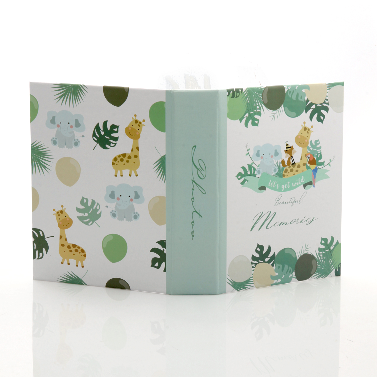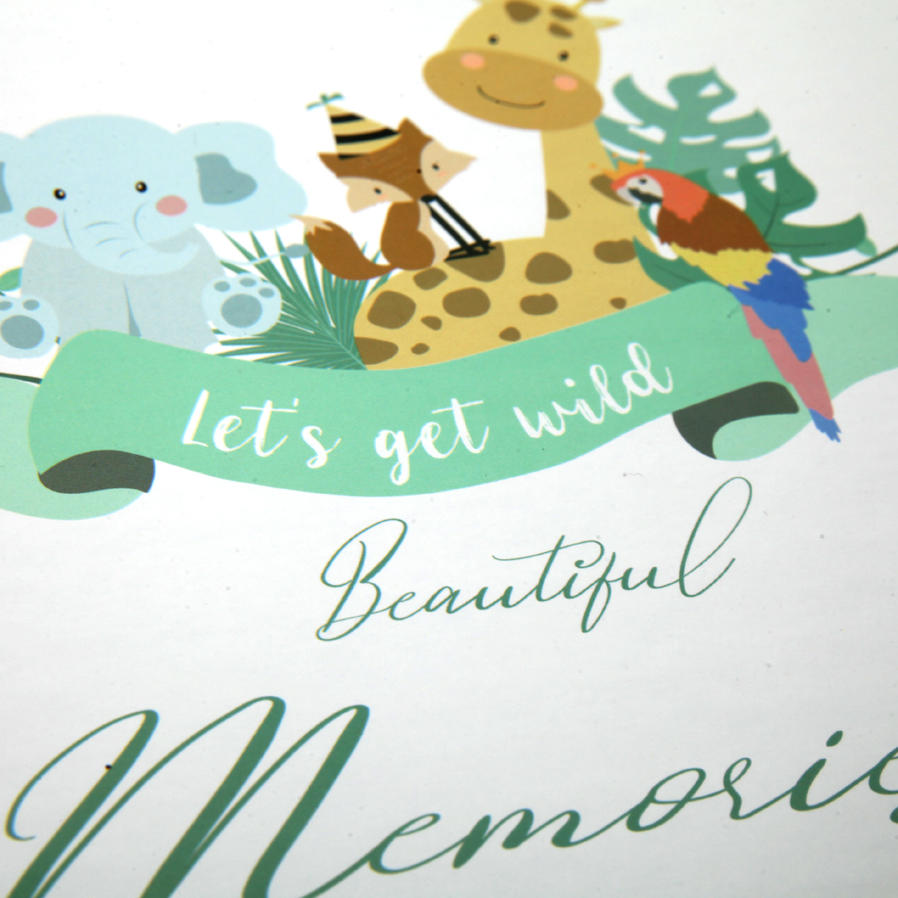💎 Bajkowa okładka – wykonana z laminowanego kartonu, ozdobiona pastelową grafiką z balonikami, listkami i uroczymi zwierzątkami. Na środku widnieje napis „Let’s get wild. Beautiful Memories”. Tył zdobią ilustracje żyraf, słoników i baloników, a pastelowo-niebieski grzbiet z napisem „Photos” dopełnia całości.