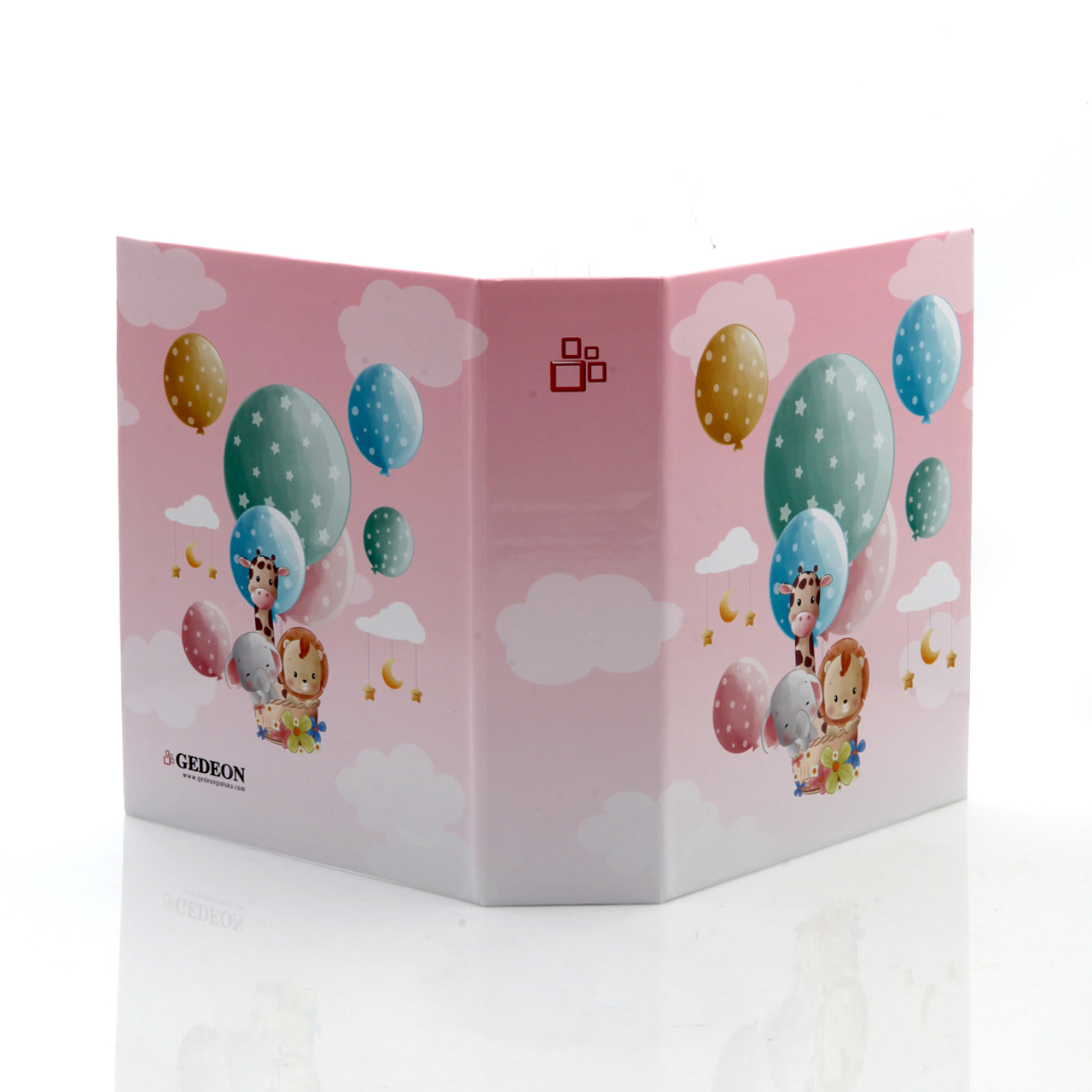 🌸 Dziecięce wzory – Okładka wykonana z laminowanego kartonu ozdobiona jest pastelowymi ilustracjami przedstawiającymi kolorowe baloniki, w jednym z nich znajdują się: słonik, żyrafa i lew. Całość jest ukazana na różowym niebie. Delikatne kolory i dziecięce wzory nadają mu wyjątkowego uroku.