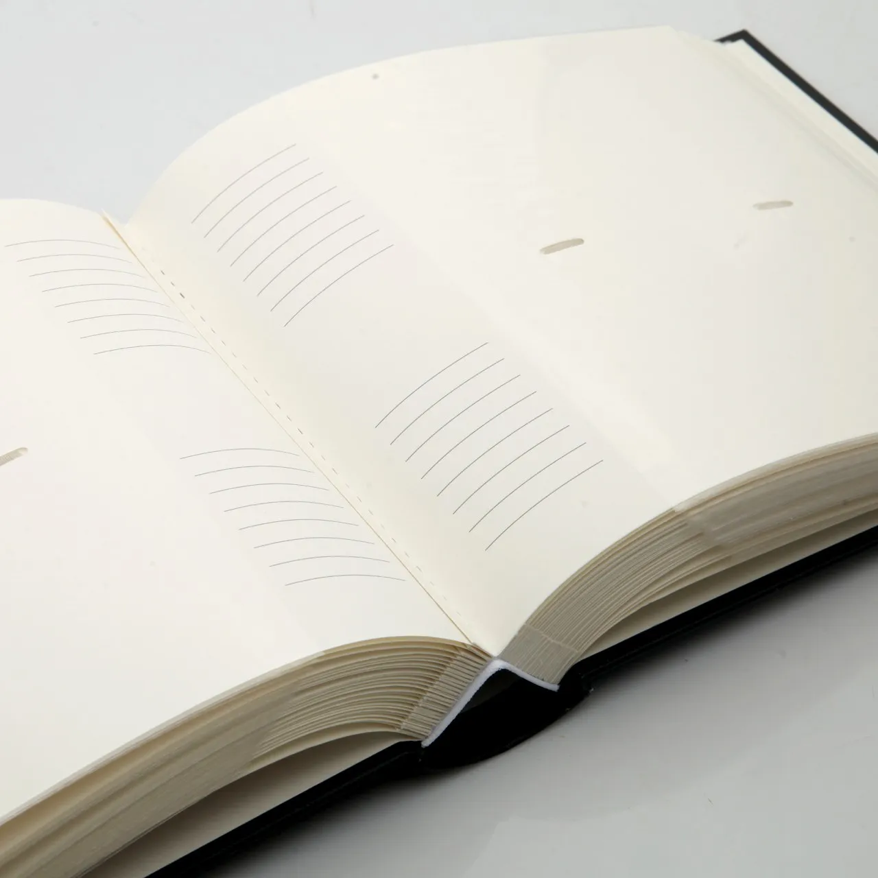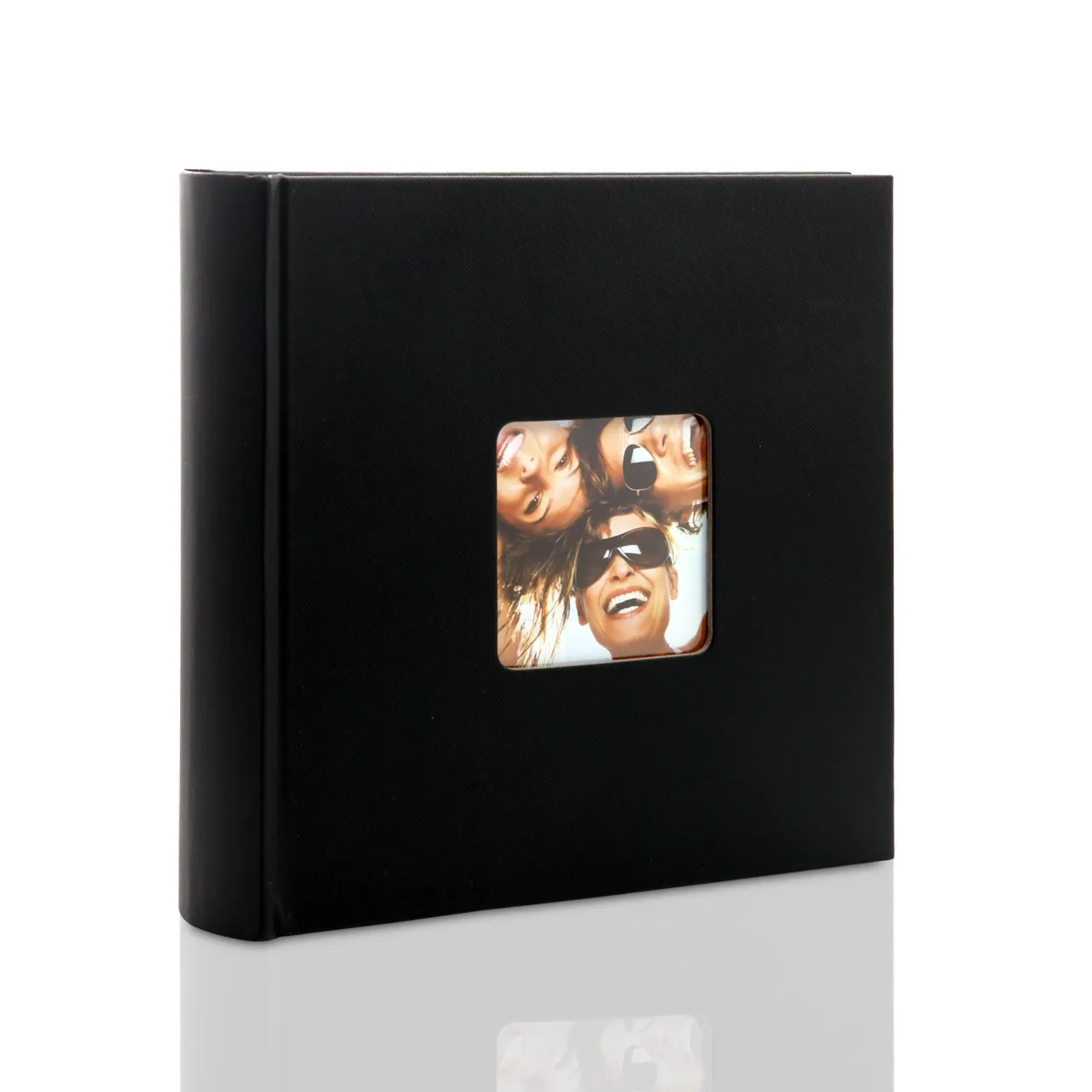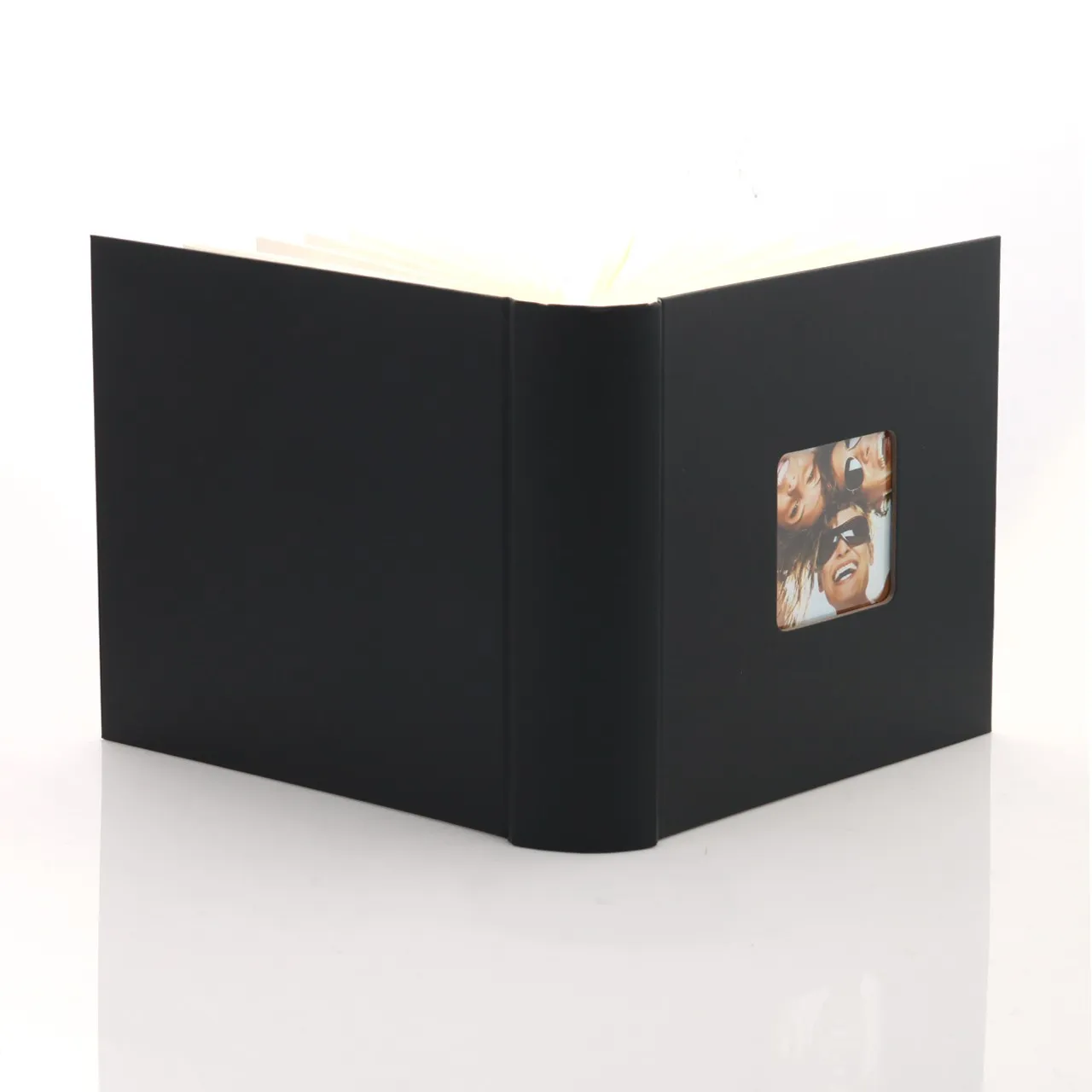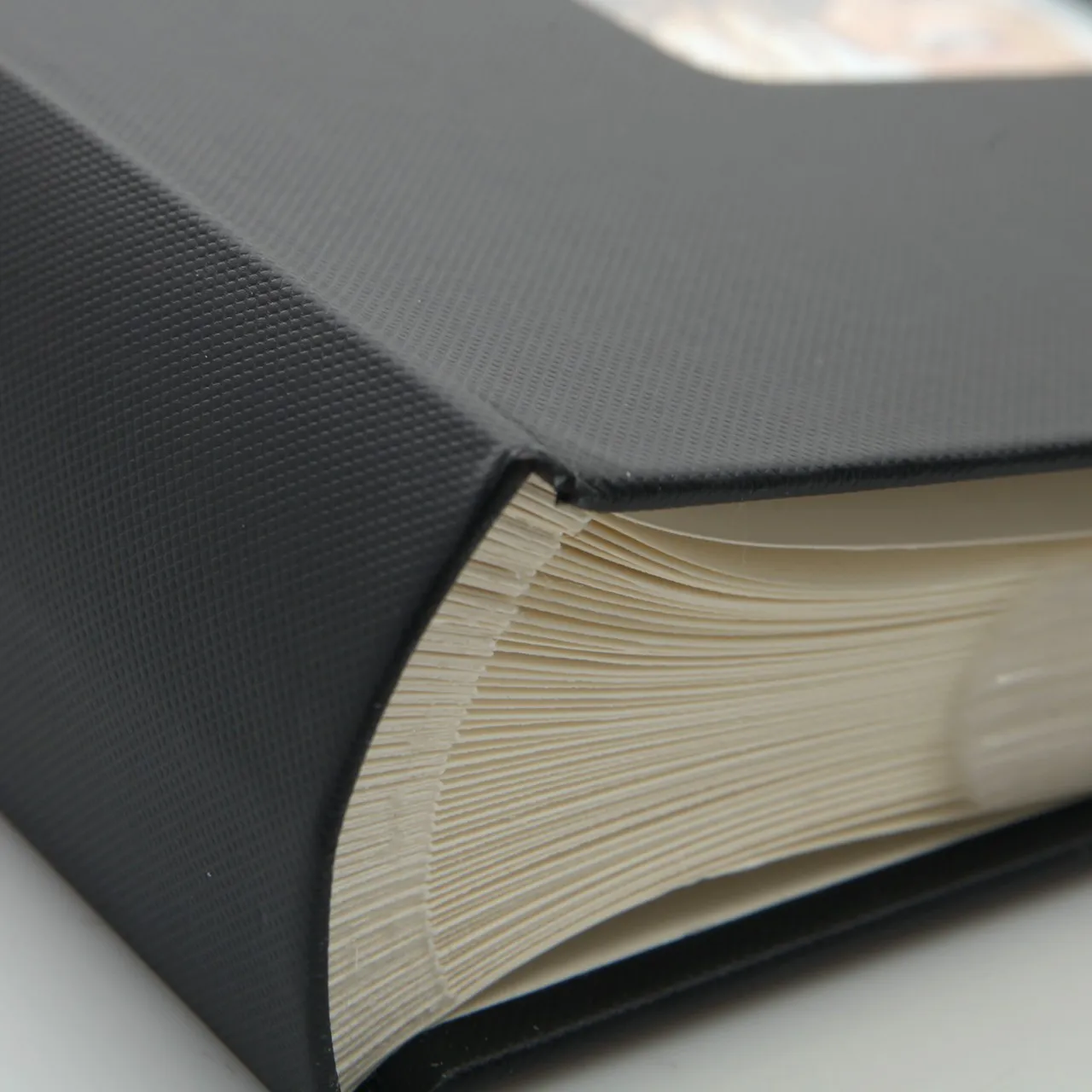 Okładka pokryta jest wysokiej jakości papierem introligatorskim o wyraźnej strukturze płótna. Głęboki, matowy czarny kolor podkreśla klasę i nadaje albumowi nowoczesnej elegancji. Na środku znajduje się okienko o wymiarach 6x6 cm – możesz umieścić tam swoje ulubione zdjęcie, nadając albumowi osobisty charakter.
