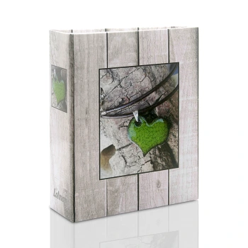 Album ozdobiony jest zdjęciem szarych desek, na których umieszczone jest zdjęcie zielonego serduszka powieszonego na drzewie.