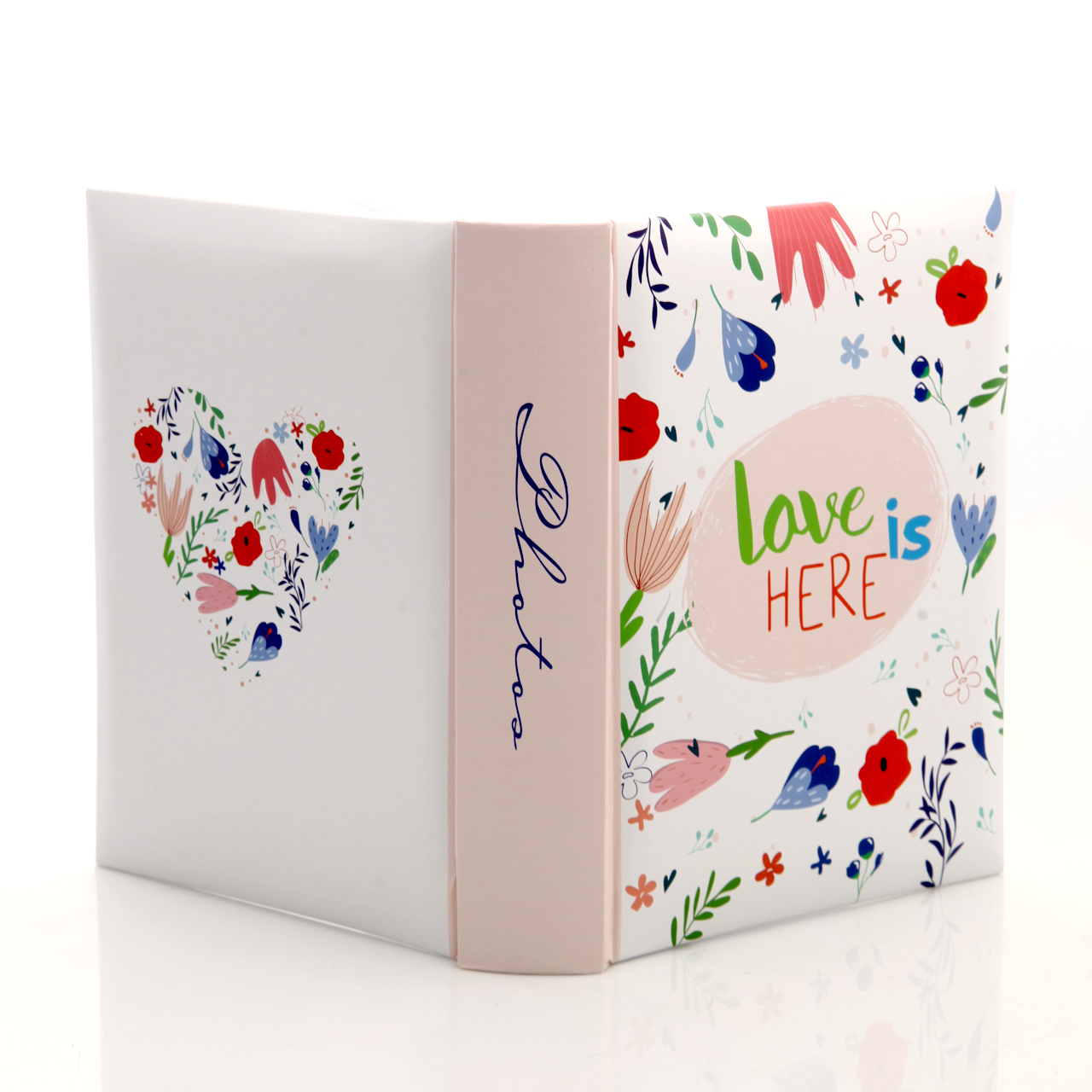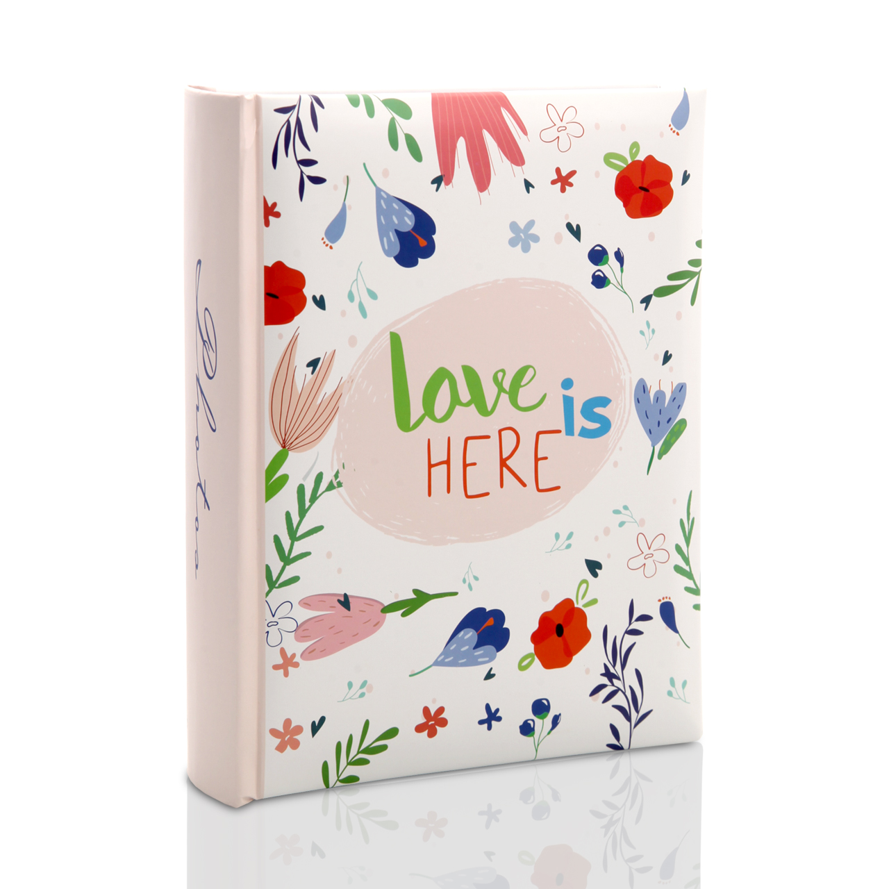 Album Lovela to romantyczna propozycja do przechowywania wspomnień w formie fotografii. Wykonany został z laminowanego kartonu, który chroni okładkę przed zabrudzeniami i uszkodzeniami. Front zdobi kolorowy motyw kwiatków oraz napis „Love is here”, co nadaje całości delikatnego, pełnego uroku charakteru. Grzbiet albumu utrzymany jest w różowym kolorze i ozdobiony napisem „photos”, a tył okładki także posiada dekoracyjny nadruk, dzięki czemu album prezentuje się estetycznie z każdej strony.✨🌿.