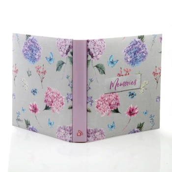 Na okładce nadrukowano piękne kolorowe kwiaty. W ramce na środku znajduje się fioletowy napis "Memories" .