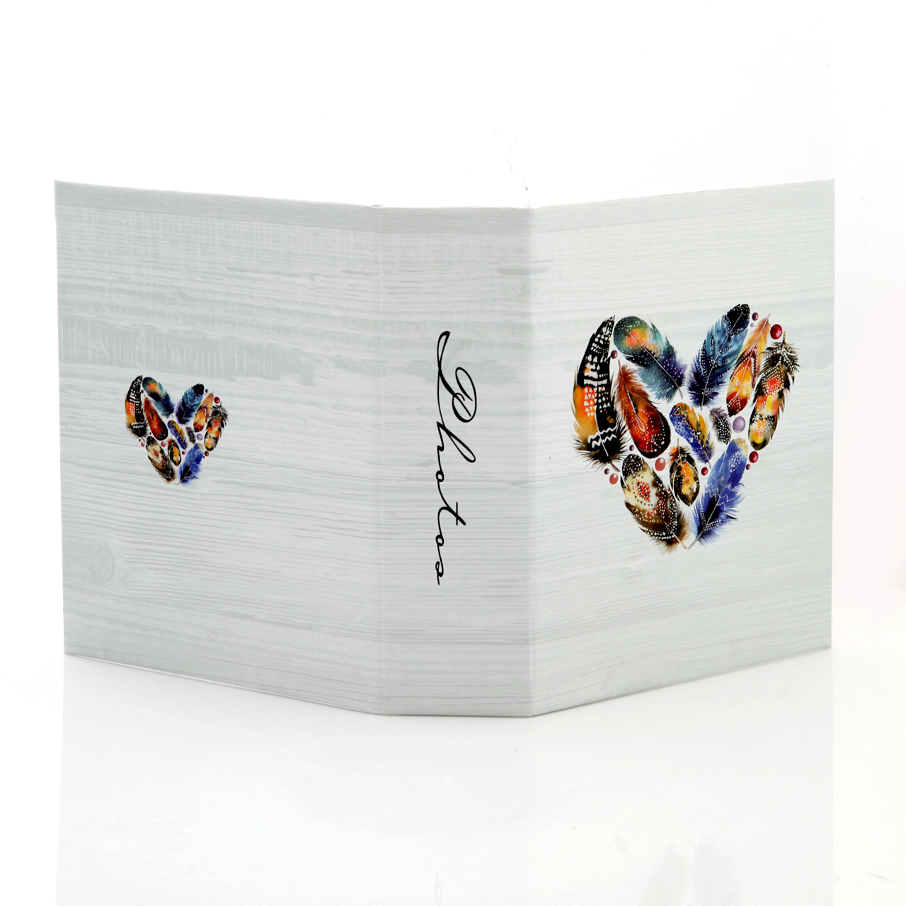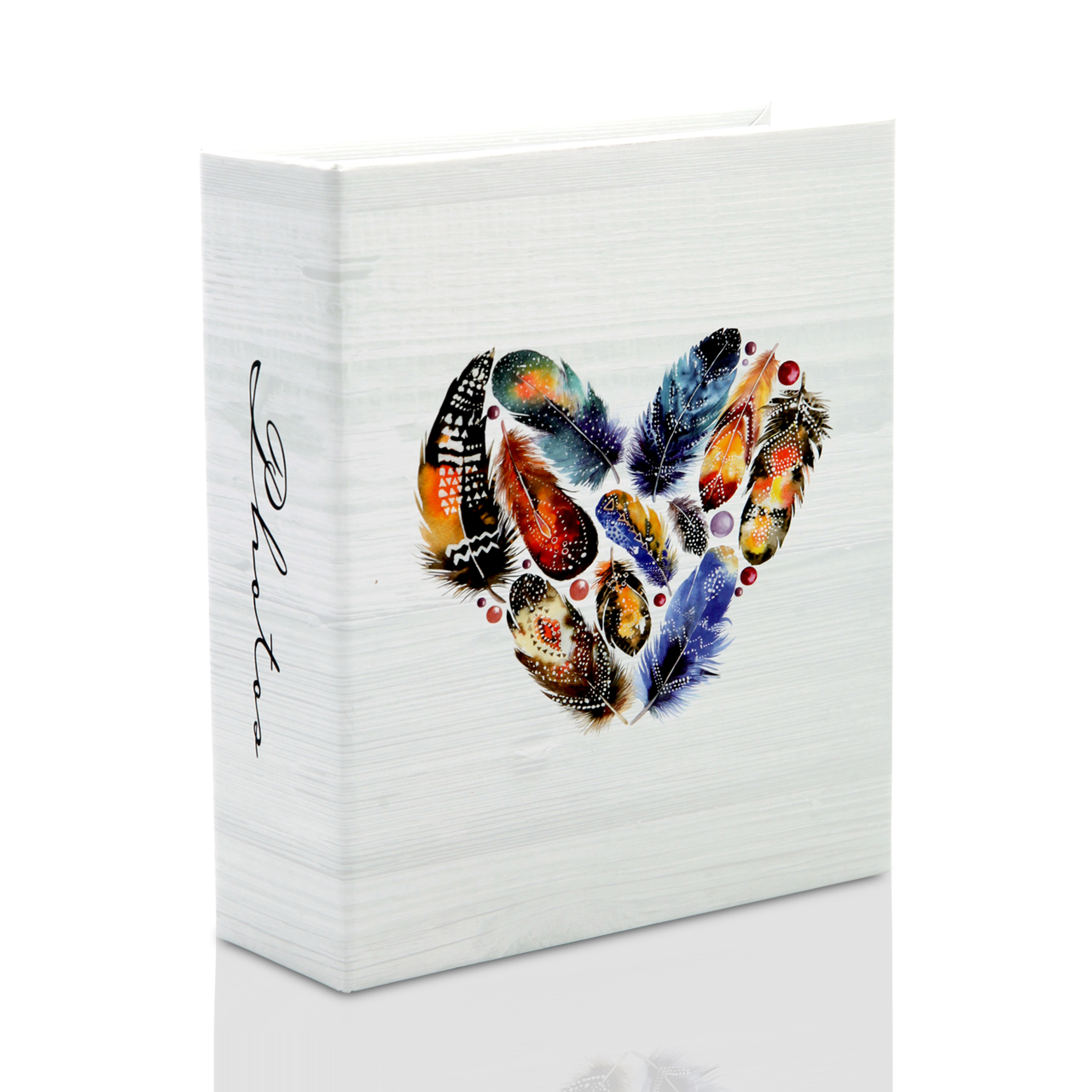 🌸 Kolorowe wzory – laminowana okładka zachwyca uroczymi, kolorowymi piórkami układającymi się w serce. Tło imitujące drewno pięknie komponuje się z całością, a grzbiet z napisem „Photos” dopełnia całość.