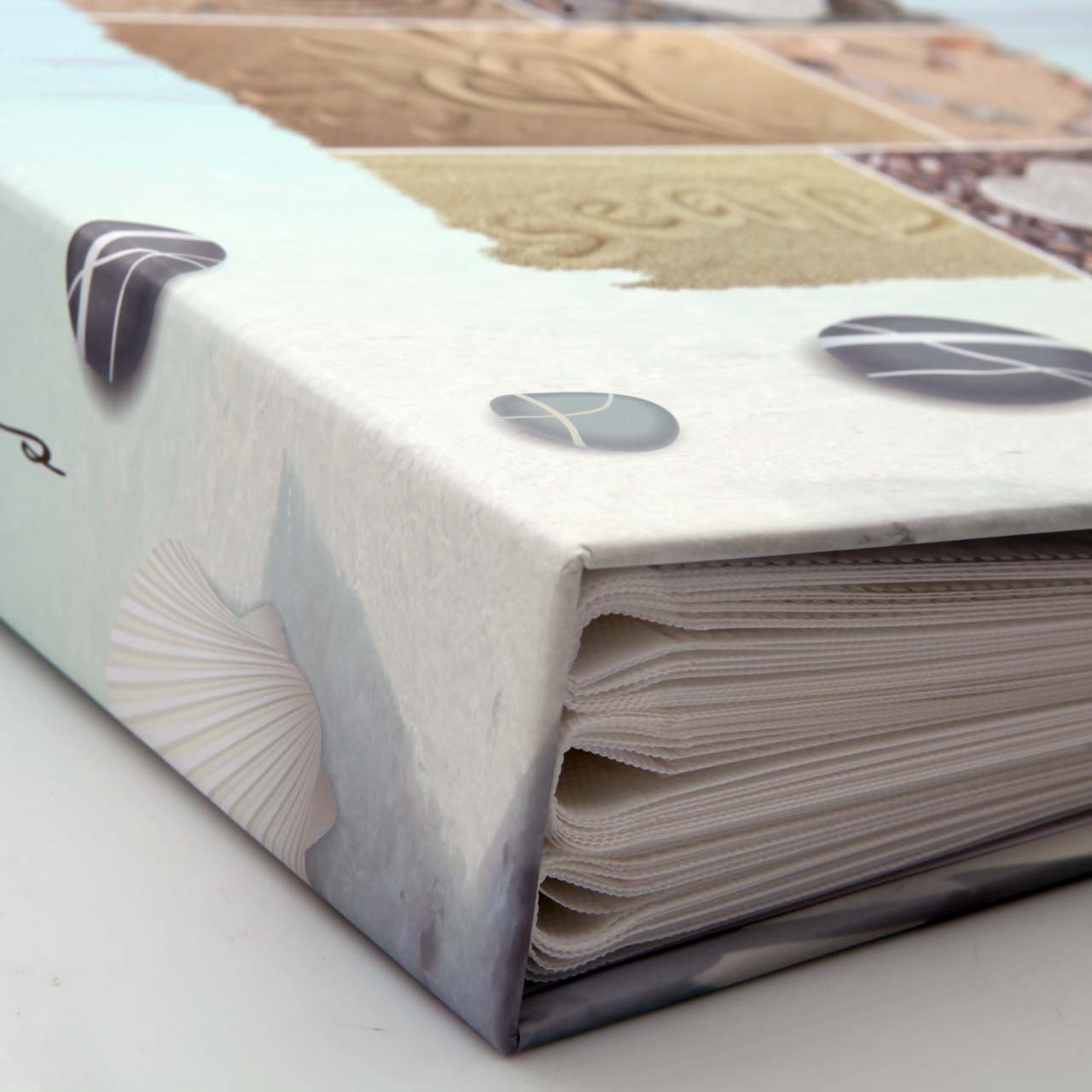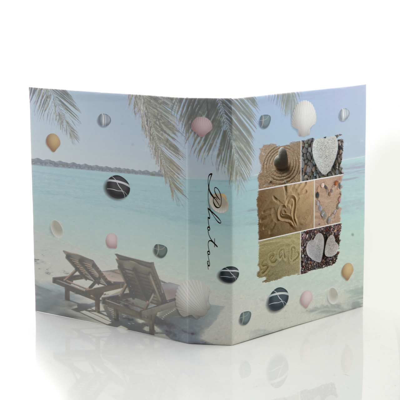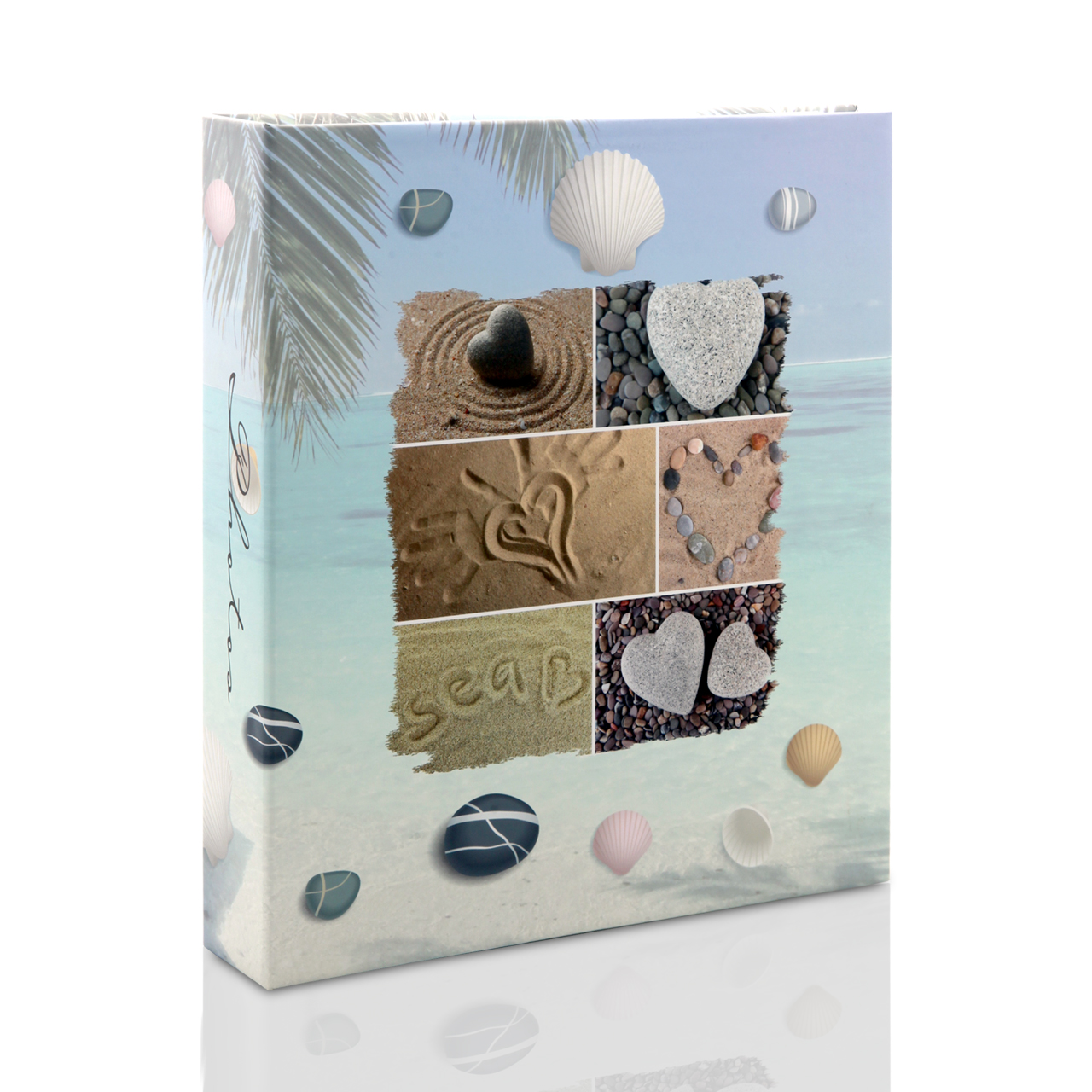 🌸 Wakacyjna grafika – matowa, laminowana okładka zachwyca morską grafiką, która przedstawia kolaż serc z kamieni i piasku na tle morza, co nadaje albumowi ciepły, sentymentalny charakter. Grzbiet z napisem "photos" i zdobiony tył dopełniają estetyczną całość.