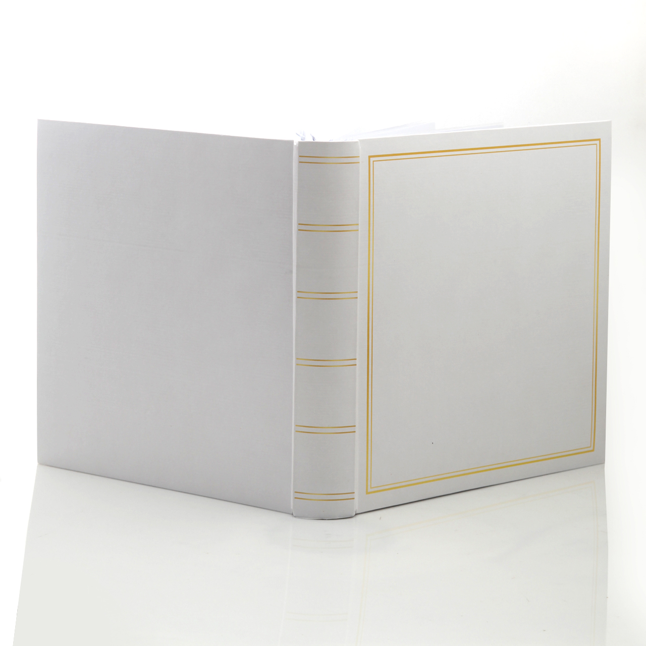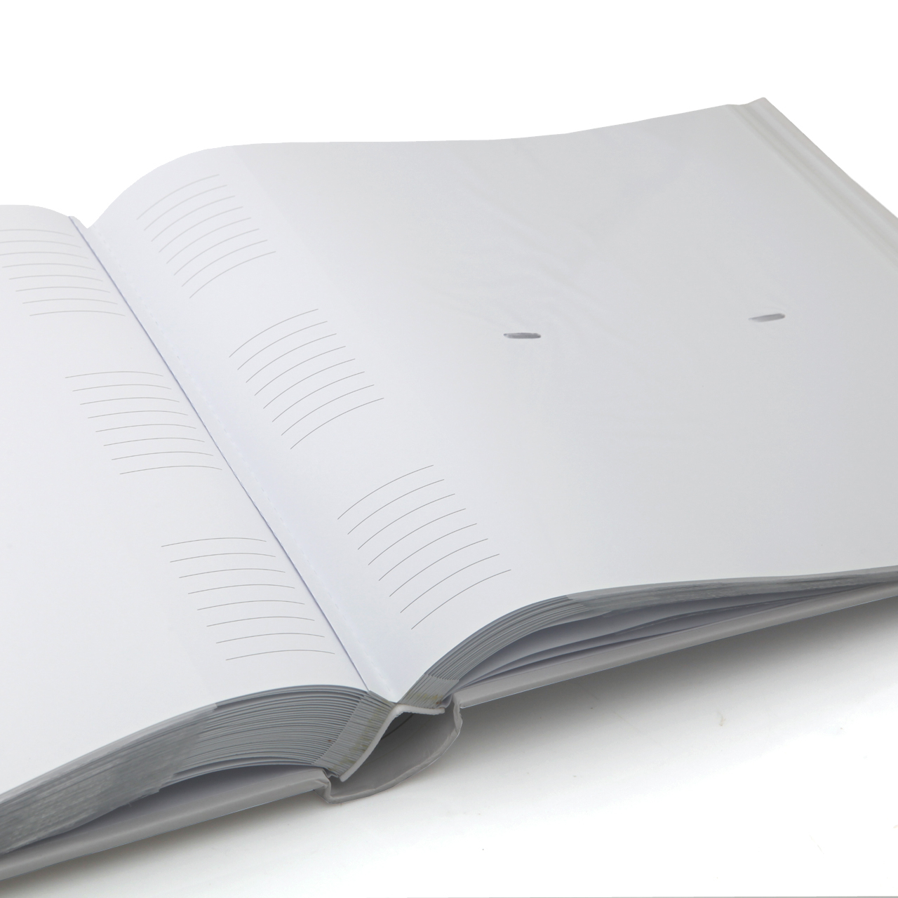 Album ma białe, papierowe karty z przeźroczystymi kieszonkami na zdjęcia.