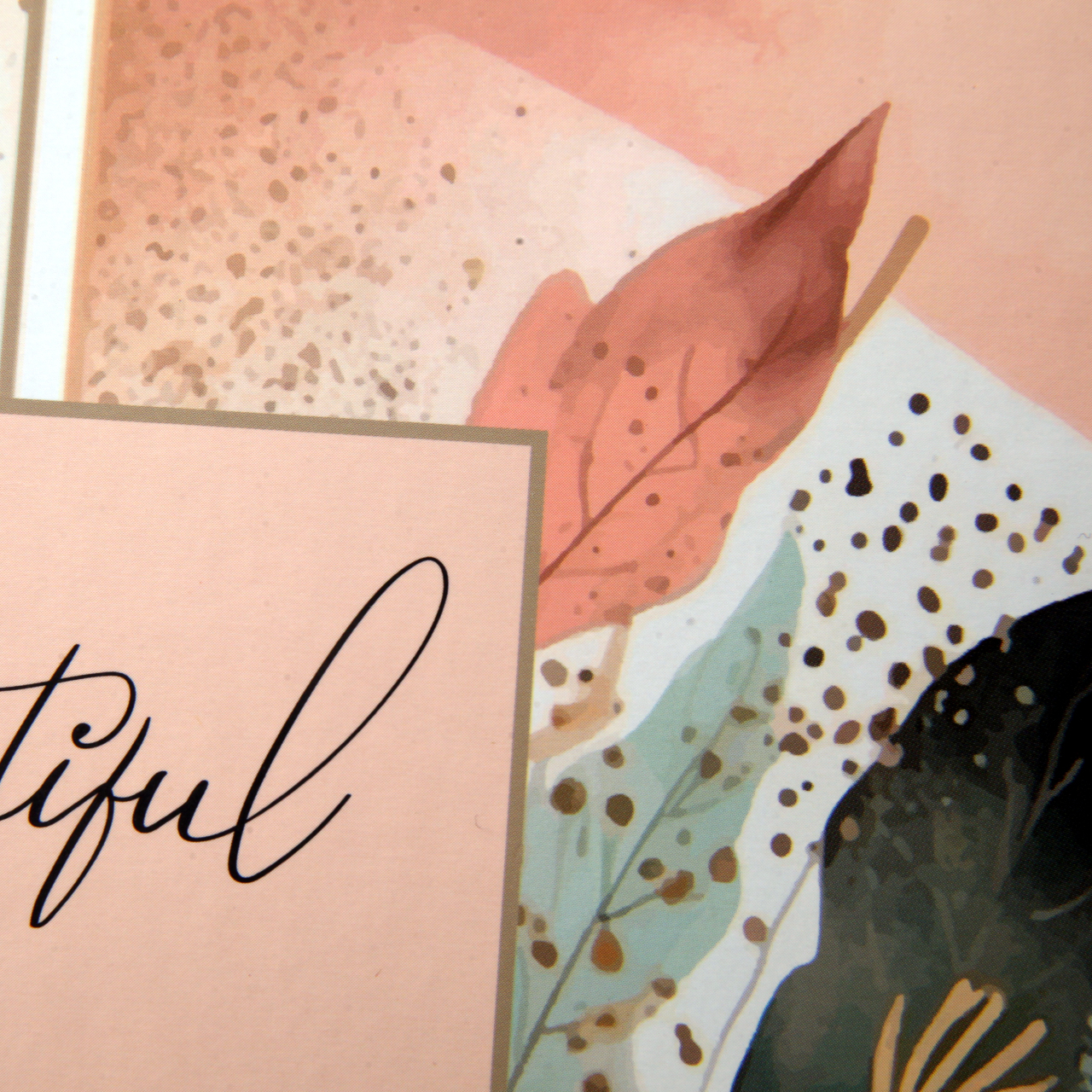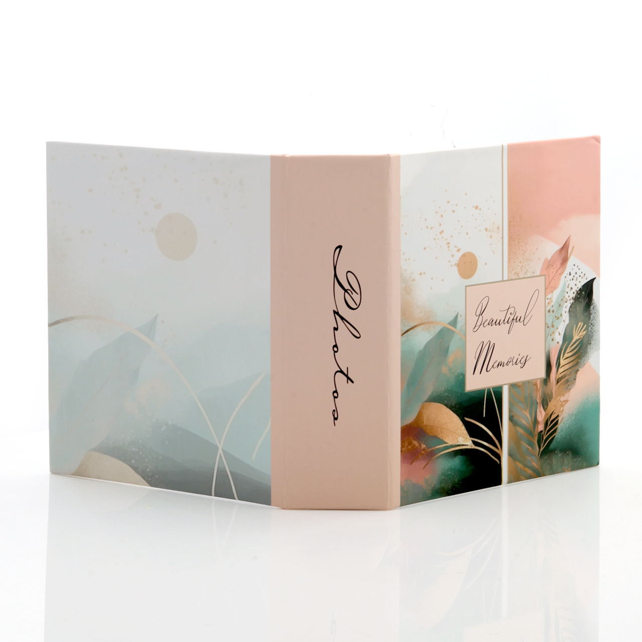 🌸 Kolorowe wzory – laminowana okładka zachwyca uroczymi, pastelowymi kolorami z grafiką liści. Tło jest biało- różowe, a w centralnej części albumu widnieje ozdobny napis "Beautiful Memories". Grzbiet z napisem „Photos” dopełnia całość.