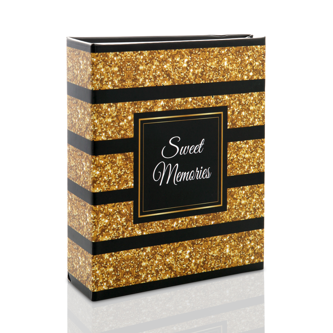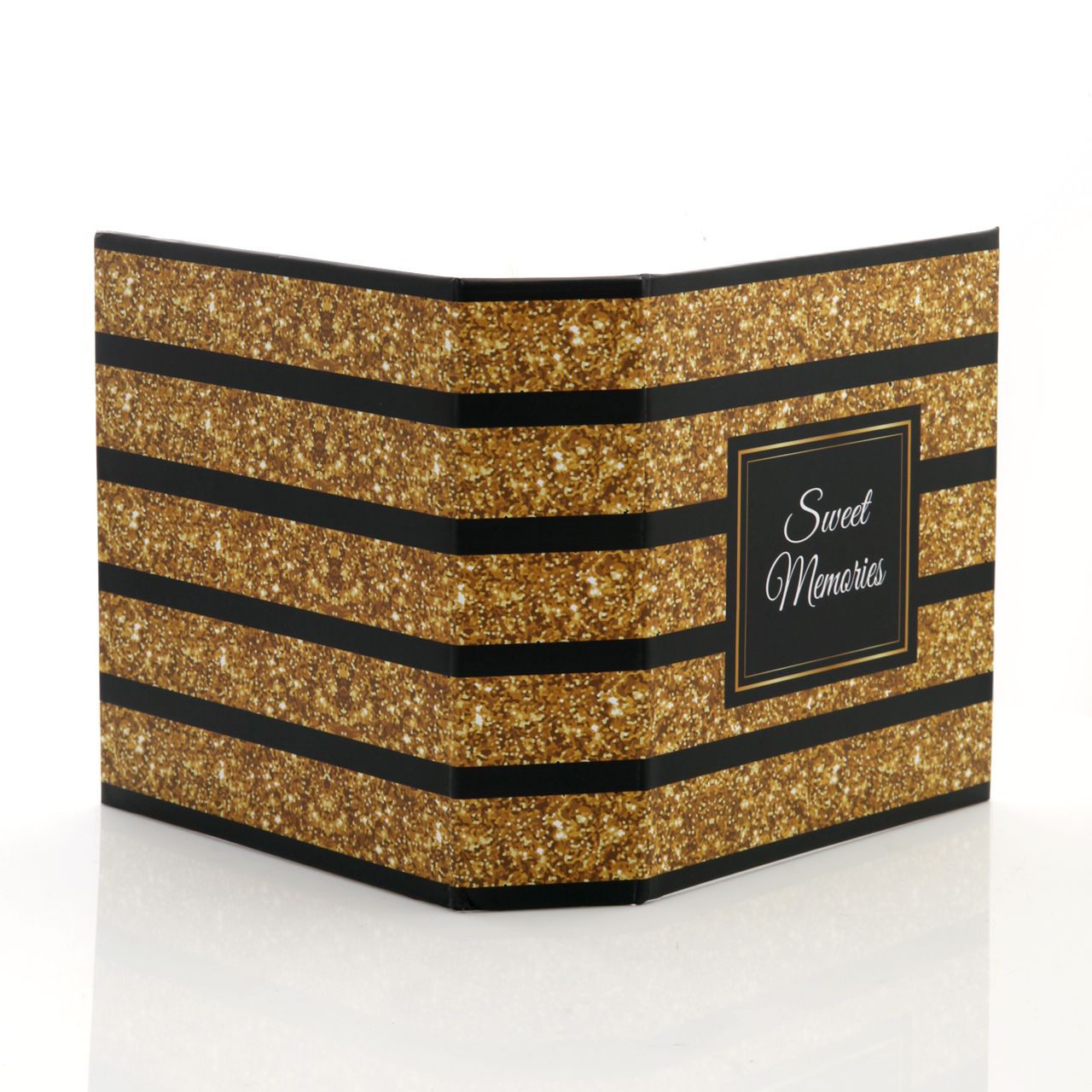 Złote wzory – laminowana okładka zachwyca eleganckim, nadrukiem złotego brokatu, na przemian z czarnymi paskami. Na środku nadrukowana jest rameczka, w której znajduje się napis "Sweet Memories".