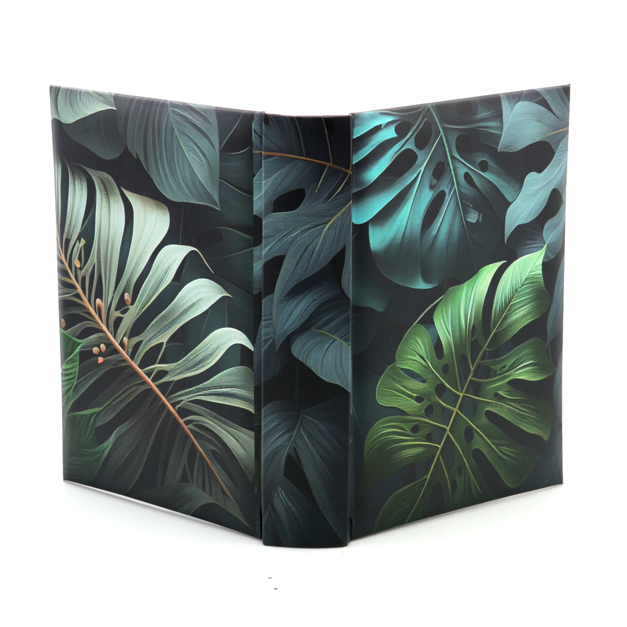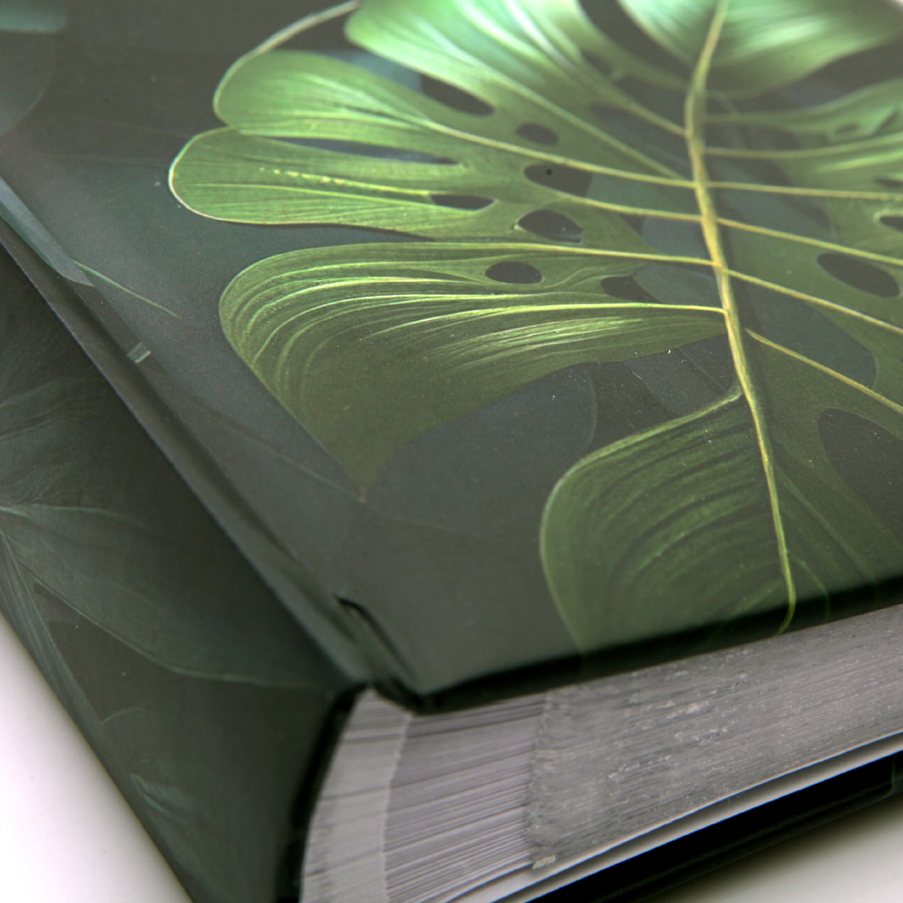 Okładka albumu została wykonana z laminowanego kartonu i zdobiona efektownym motywem roślinnym. Na czarnym tle widoczne są liście w różnych odcieniach zieleni, co nadaje całości eleganckiego i nowoczesnego charakteru. Grzbiet zdobią dodatkowe akcenty roślinne, a tył albumu posiada dopasowane zdobienia, co sprawia, że prezentuje się wyjątkowo estetycznie.