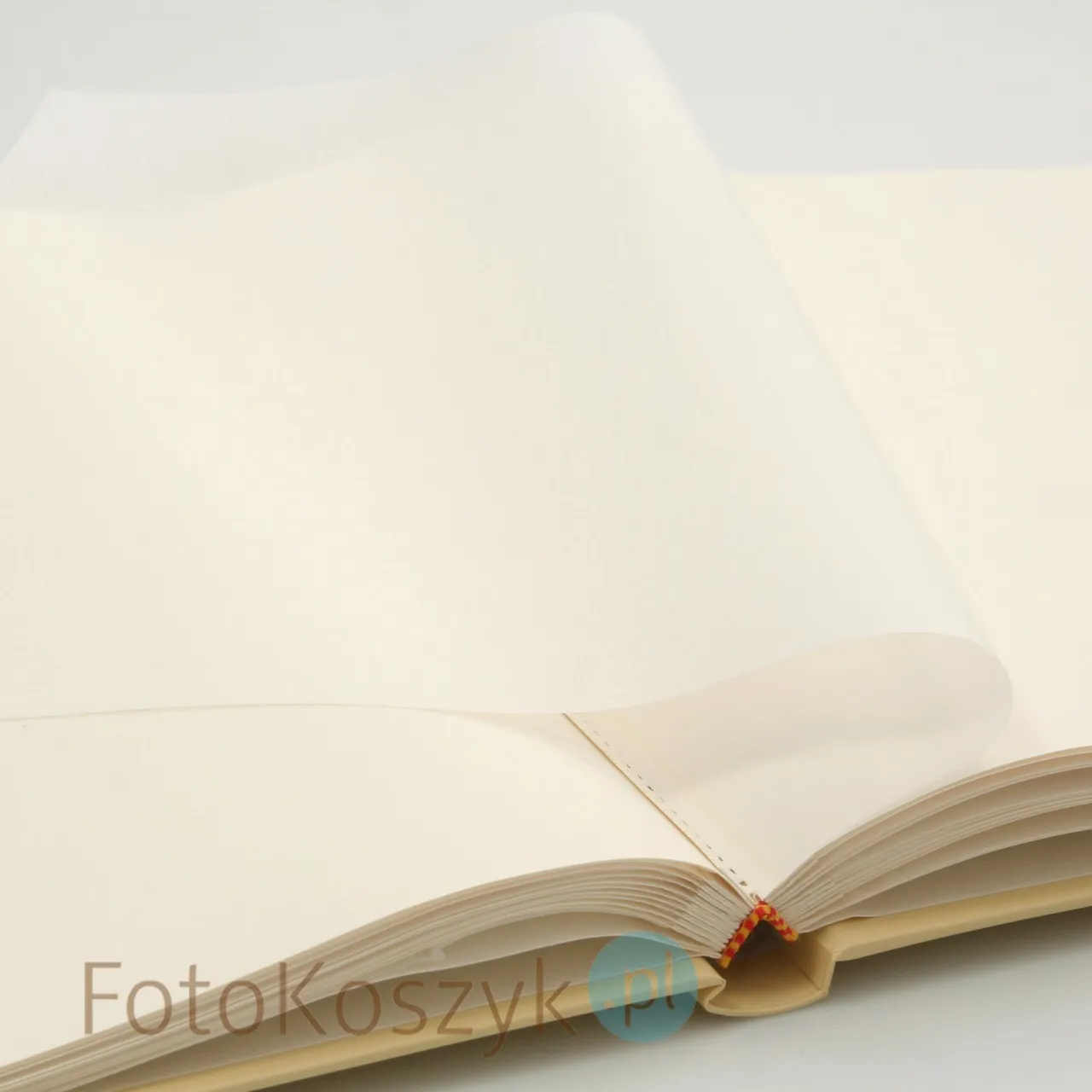 Wewnątrz znajduje się 24 strony (12 kart) w kremowym kolorze, przekładanych białym pergaminem. Pergamin chroni fotografie przed sklejaniem i zarysowaniami, a jednocześnie dodaje im elegancji. Strony są wszywane w grzbiet, co zapewnia trwałość i wygodę w przeglądaniu albumu.
