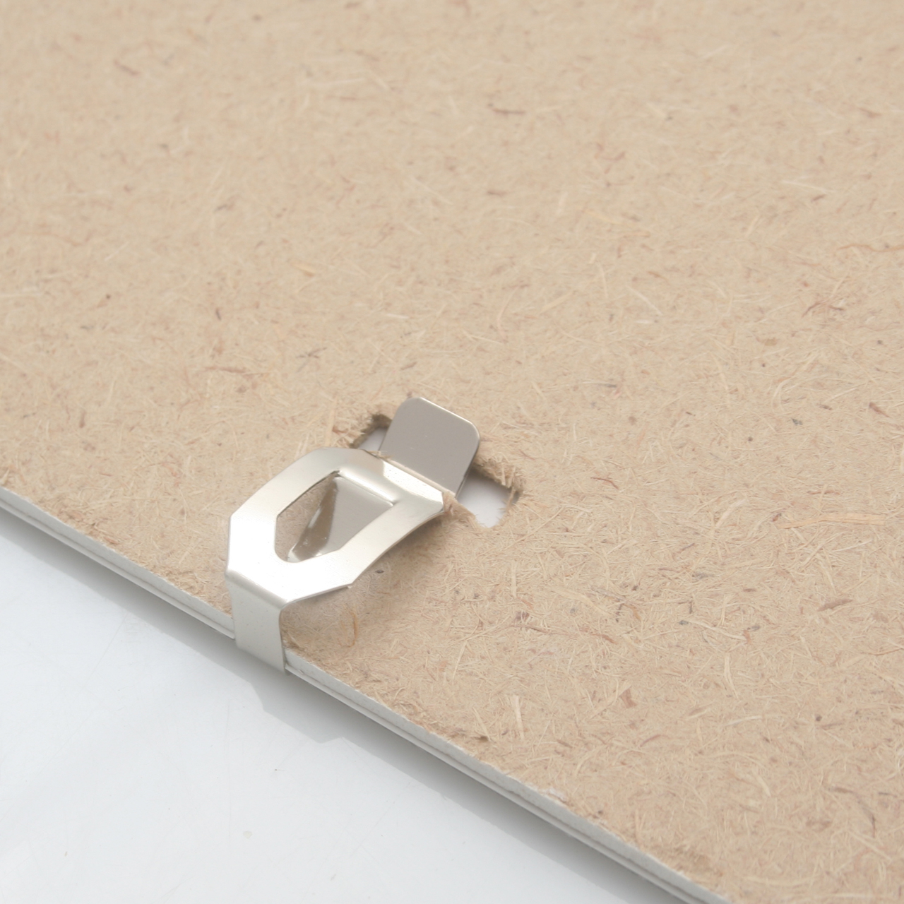 Zdjęcie przytrzymują cztery metalowe klipsy obejmujące plexi, zdjęcie i kartonowe tło.