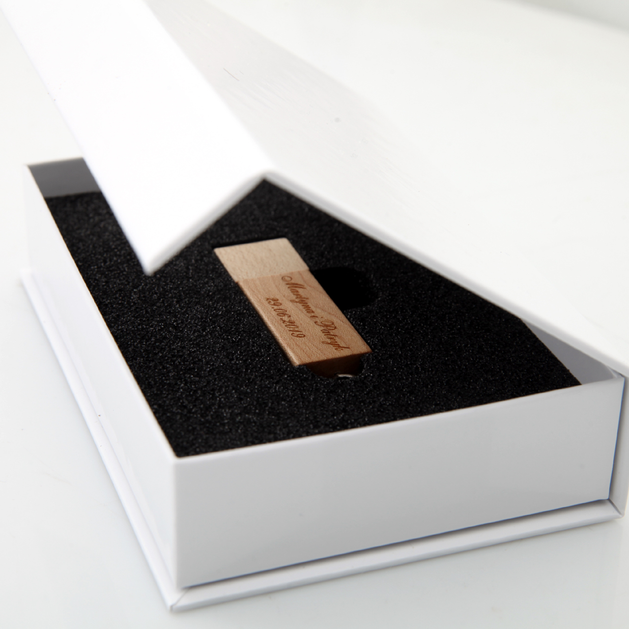 Eleganckie, białe pudełko przeznaczone do bezpiecznego i efektownego przechowywania pendrive’a. Idealne jako opakowanie dla materiałów fotograficznych, sesji zdjęciowych lub filmów przekazywanych klientom.