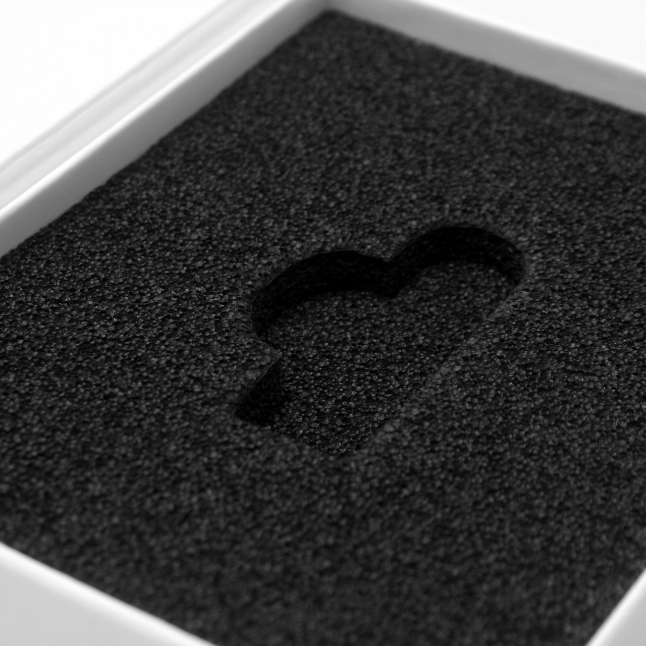 W środku pudełko jest białe, wyłożono je gruba, sztywną warstwą szarej gabki z wycięciem na mały, metalowy pendrive typu slim.