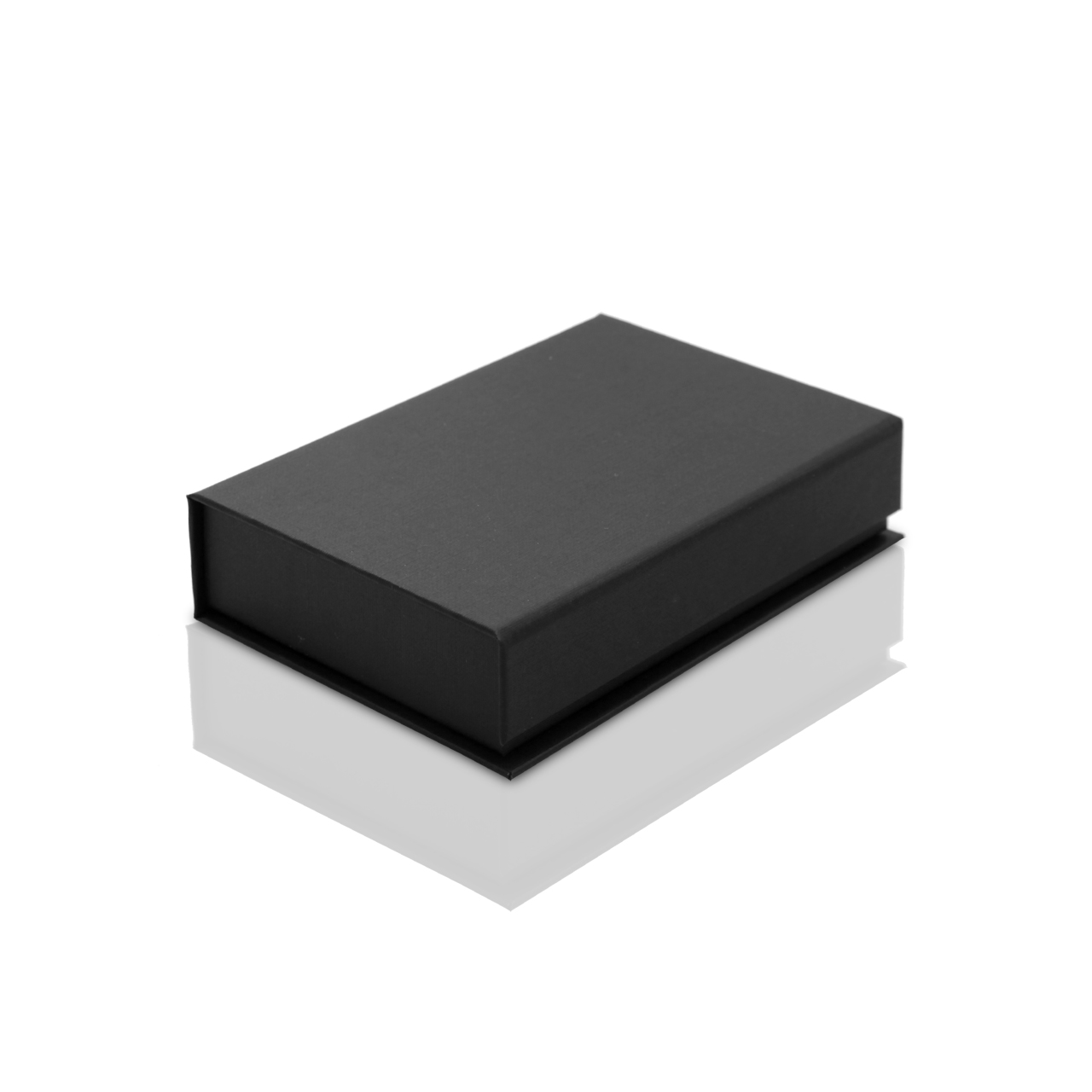 Pudełko wykonane jest z grubego kartonu, pokrytego czarnym, matowym papierem introligatorskim o delikatnej fakturze. Jednoczęściowa konstrukcja zapewnia trwałość i wygodę użytkowania.