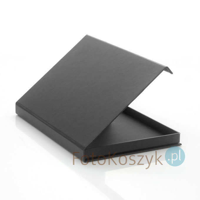 Pudełko na zdjęcia wykonane zostało z grubej i sztywnej tektury pokrytej czarną okleiną wykonaną ze skóry ekologicznej.