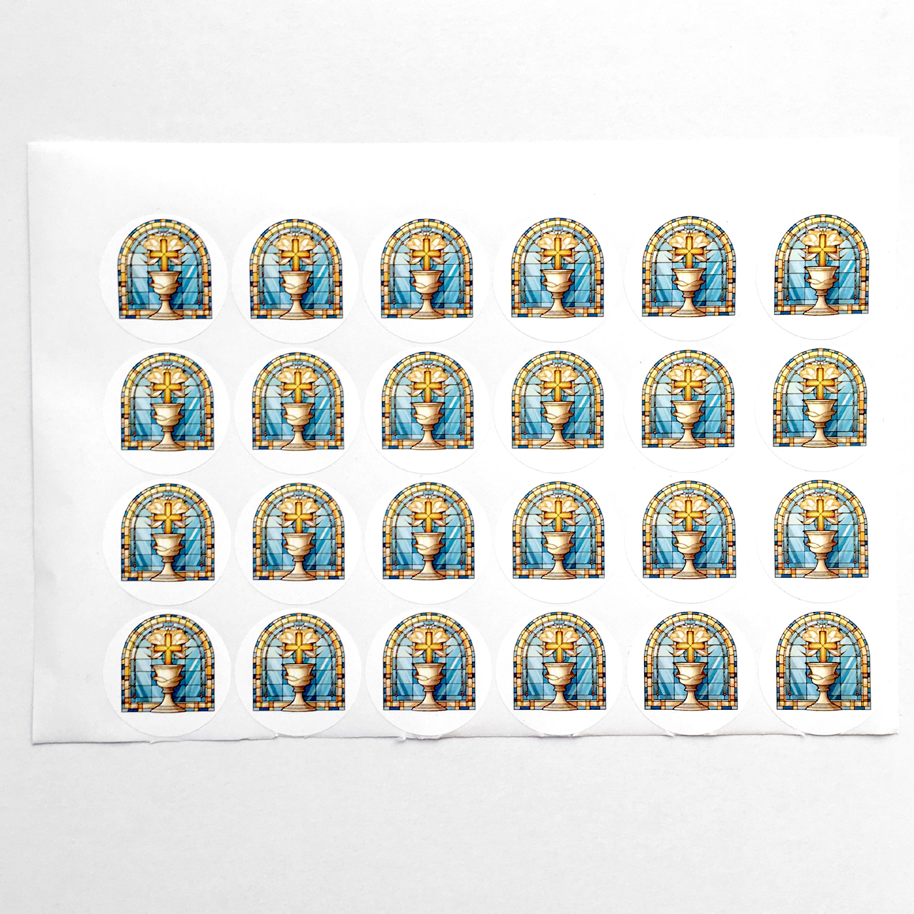 Nadrukowano nich nadruk przypominający witraż przedstawiający kolorową chrzcielnicę oraz napis: Pamiątka Chrztu Świętego.