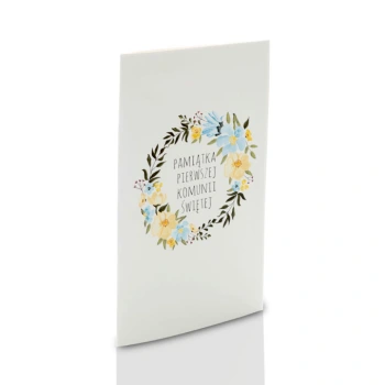 Okładka jest biała, ma ozdobny nadruk oraz napis: Pamiątka Pierwszej Komunii Świętej.