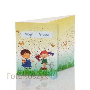 Okładka mini-albumiku jest kolorowa, ma nadrukowaną dwójkę dzieci: dziewczynkę i chłopca stojących na łące.