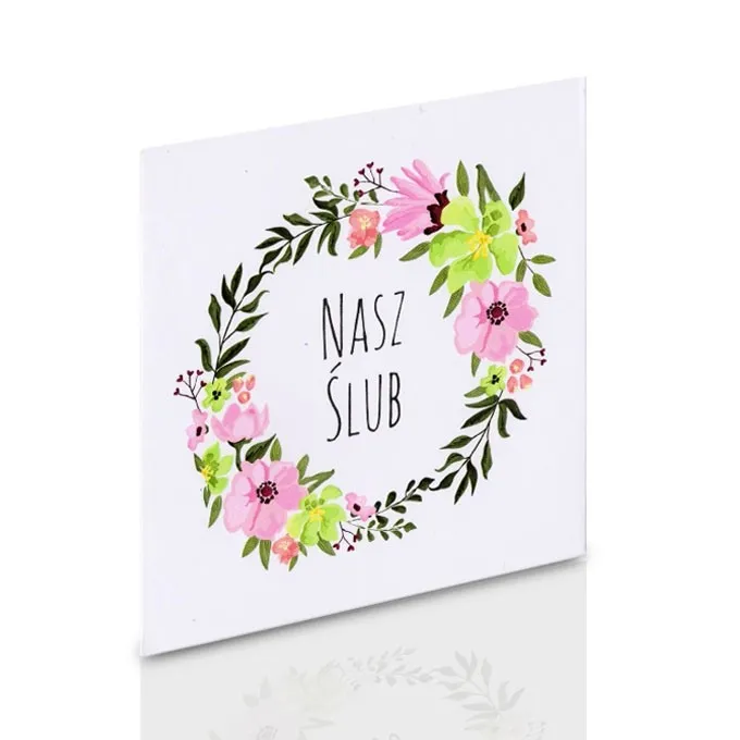 Nadrukowano na nim kolorowe, pastelowe kwiaty oraz napis: Nasz Ślub.