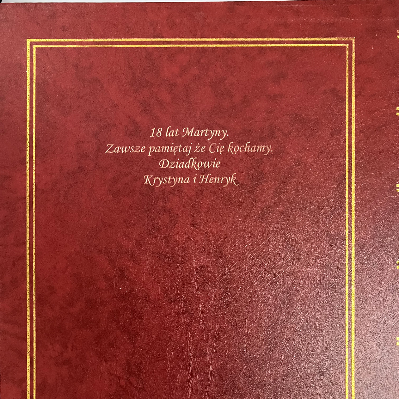 Okładka albumu wykonana jest z bordowej skóry ekologicznej o nieregularnym wybarwieniu – miejscami jaśniejszym i ciemniejszym, co dodaje jej elegancji i klasycznego charakteru. Przód zdobi delikatna, złota ramka ✨, a grzbiet ozdobiono poprzecznymi, złotymi paskami, które podkreślają tradycyjny styl. Tył albumu pozostaje gładki, co nadaje całości prostoty i szyku.