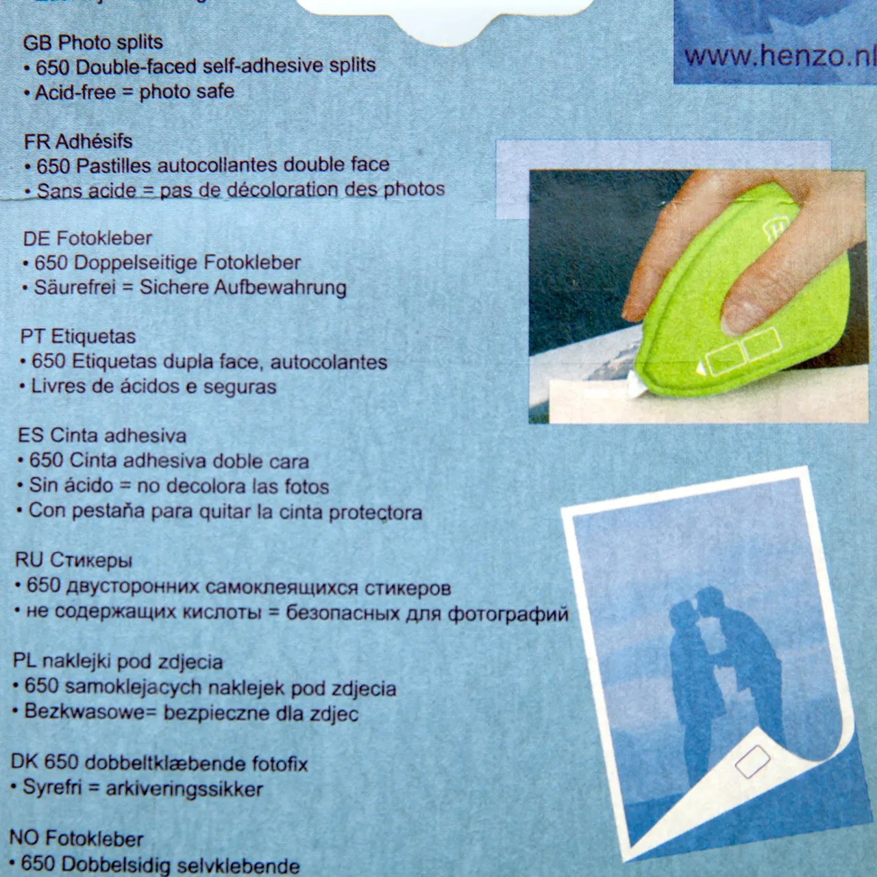 Przylepki Henzo są acid-free, dzięki czemu nie powodują żółknięcia, blaknięcia ani uszkodzeń zdjęć i papieru. Ich cienka, elastyczna formuła sprawia, że fotografie nie wyginają się i nie odstają, w przeciwieństwie do zwykłych taśm dwustronnych.