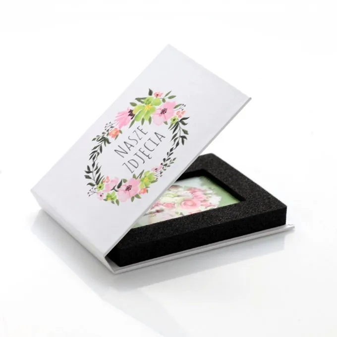 W środku pudełko ma czarną gabkę z gotowym wycięciem na pendrive'y w kształcie karty kredytowej, które można zamówić tu: pendrive'y.