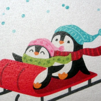 Zdobią ją pingwinki zjeżdżające na sankach oraz napis: Wesołych Świąt.